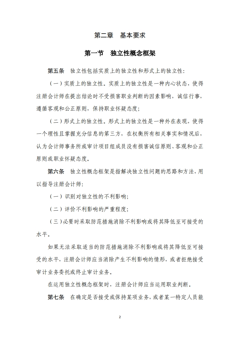 中国注册会计师职业道德守则第4号审计和审阅业务对独立性的要求第一章总则第一条为了规范注册会计师职业行为,指导注册会计师运用独立性概念框架,解决执行审计和审阅业务时遇到的独立性问题,制定本守则。第二条注册会计师在执行审计和审阅业务时应当遵守相同的独立性要求。本守则对审计业务提出的独立性要求同样适用于审阅业务。第三条客观和公正原则要求审计项目组成员、会计师事务所、网络事务所与审计客户保持独立。在执行审计业务时,审计项目组成员、会计师事务所、网络事务所应当维护公众利益,独立于审计客户。第四条在提供审计服务的过程中,可能存在多种对独立性产生不利影响的情形,注册会计师应当对此保持警觉,并按照本守则的规定办理。当遇到本守则未列举的情形时,注册会计师应当运用独立性概念框架评价具体情形对独立性的影响,并采取防范措施消除不利影响或将其降低至可接受的水平。