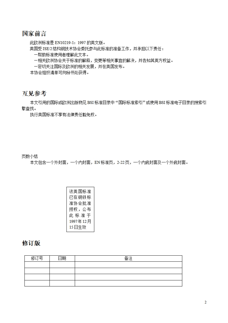 中文版本-英国标准EN10219-1-2006-12-28348072@abc6个月前发布关注私信0.70MB28页027中文版本-英国标准EN10219-1-2006-12-28此内容为付费资源,请付费后查看¥13¥33黄金会员免费钻石会员免费立即购买您当前未登录!建议登陆后购买,可保存购买订单付费资源 第1页 / 共28页 第2页 / 共28页 试读已结束,还剩26页,您可下载完整版后进行离线阅读 THE END标准规范 文本预览 非合金钢和细晶粒结构钢冷成型焊接空心钢管第一部分:交货技术条件1 查看更多 收起部分 喜欢就支持一下吧收藏