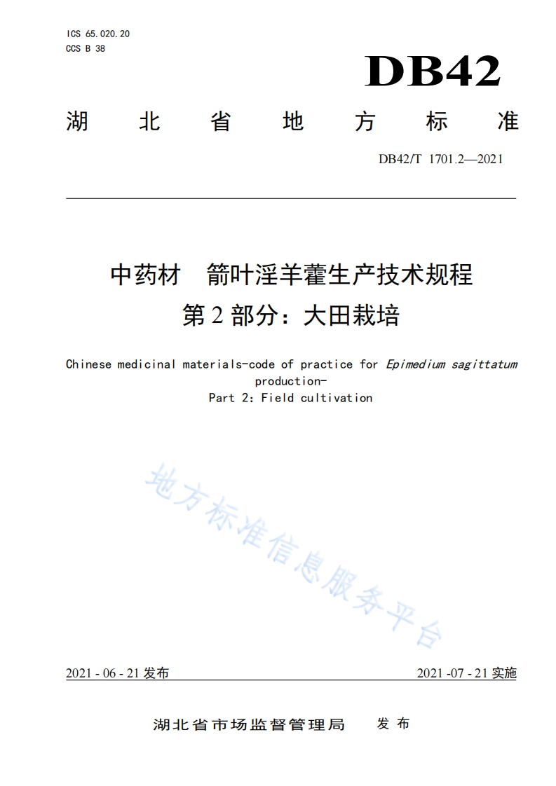 1C565.020.20CCS B 38DB42湖北省地方标准DB42/T1701.2-2021中药材箭叶淫羊藿生产技术规程第2部分:大田栽培Chinese medicinal materials-code of practice for Epimedium sagittatumproduction-Part 2:Field cultivation地方标准信息服务平台2021-06-21发布2021-07-21实施湖北省市场监督管理局发布