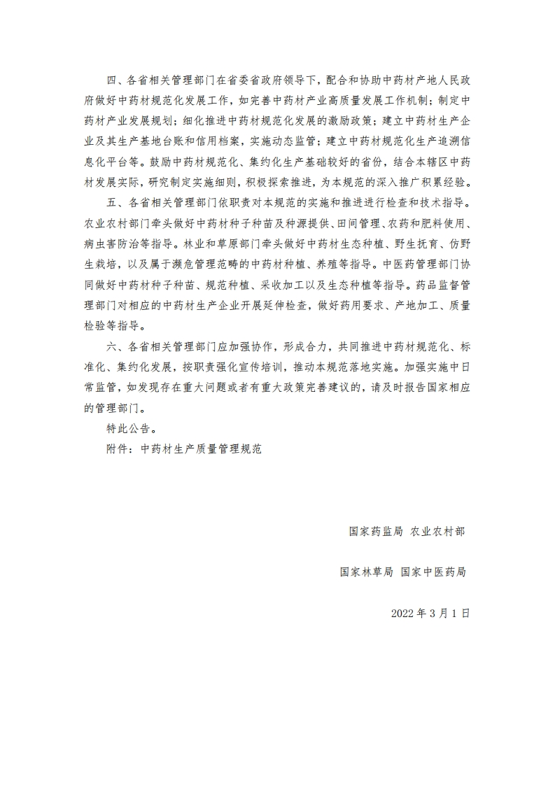 国家药监局农业农村部国家林草局国家中医药局关于发布《中药材生产质量管理规范》的公告(2022年第22号)为贯彻落实《中共中央国务院关于促进中医药传承创新发展的意见》,推进中药材规范化生产,加强中药材质量控制,促进中药高质量发展,依据《中华人民共和国药品管理法》《中华人民共和国中医药法》,国家药监局、农业农村部、国家林草局、国家中医药局研究制定了《中药材生产质量管理规范》(以下称本规范),现予发布实施,并将有关事项公告如下:一、本规范适用于中药材生产企业规范生产中药材的全过程管理,是中药材规范化生产和管理的基本要求。本规范涉及的中药材是指来源于药用植物、药用动物等资源,经规范化的种植(含生态种植、野生抚育和仿野生栽培)、养殖、采收和产地加工后,用于生产中药饮片、中药制剂的药用原料。本公告所指中药材生产企业包括具有企业性质的种植、养殖专业合作社或联合社。二、鼓励中药饮片生产企业、中成药上市许可持有人等中药生产企业在中药材产地自建、共建符合本规范的中药材生产企业及生产基地,将药品质量管理体系延伸到中药材产地。鼓励中药生产企业优先使用符合本规范要求的中药材。药品批准证明文件等有明确要求的,中药生产企业应当按照规定使用符合本规范要求的中药材。相关中药生产企业应当依法开展供应商审核,按照本规范要求进行审核检查,保证符合要求。三、使用符合本规范要求的中药材,相关中药生产企业可以参照药品标签管理的相关规定,在药品标签中适当位置标示“药材符合GP要求”,可以依法进行宣传。对中药复方制剂,所有处方成份均符合本规范要求,方可标示。省级药品监督管理部门应当加强监督检查,对应当使用或者标示使用符合本规范中药材的中药生产企业,必要时对相应的中药材生产企业开展延伸检查,重点检查是否符合本规范。发现不符合的,应当依法严厉查处,责令中药生产企业限期改正、取消标示等,并公开相应的中药材生产企业及其中药材品种,通报中药材产地人民政府。