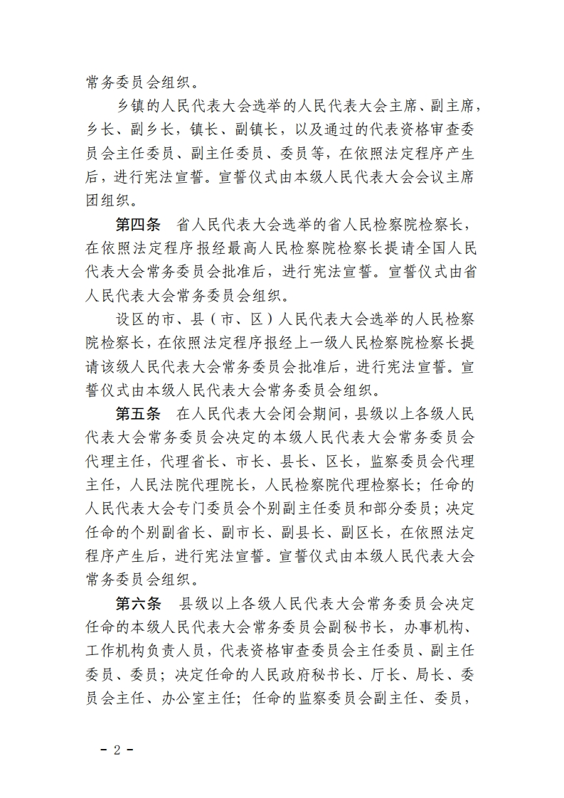 山东省实施宪法宣誓制度办法(2015年12月3日山东省第十二届人民代表大会常务委员会第十七次会议通过2018年3月29日山东省第十三届人民代表大会常务委员会第二次会议修订根据2022年6月9日山东省第十三届人民代表大会常务委员会第三十五次会议《关于修改〈山东省人民代表大会常务委员会人事任免办法〉等四件地方性法规的决定》修正)第一条为了彰显宪法权威,激励和教育国家工作人员忠于宪法、遵守宪法、维护宪法,加强宪法实施,根据《全国人民代表大会常务委员会关于实行宪法宣誓制度的决定》等有关法律法规,结合本省实际,制定本办法。第二条本省各级人民代表大会及县级以上各级人民代表大会常务委员会选举或者决定任命的国家工作人员,以及地方各级人民政府、监察委员会、人民法院、人民检察院任命的国家工作人员,在就职时应当公开进行宪法宣誓。第三条省、设区的市、县(市、区)人民代表大会选举的常务委员会主任、副主任、秘书长、委员,省长、副省长,市长、副市长,县长、副县长,区长、副区长,监察委员会主任、人民法院院长,以及通过的人民代表大会专门委员会主任委员、副主任委员、委员等,在依照法定程序产生后,进行宪法宣誓。宣誓仪式由本级人民代表大会会议主席团组织。根据情况,大会主席团可以委托本级人民代表大会-1-
