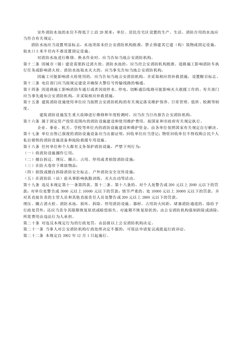重庆市消防设施管理规定类别:政府规章2002年10月15日重庆市人民政府第122次常务会议通过,自2002年12月1日起施行第一条为进一步加强消防设施的管理,适应公共消防安全的需要,增强抗御火灾的能力,根据《重庆市消防条例》,制定本规定。第二条本市行政区域内城市消防设施的管理,适用本规定。本市行政区域内乡和集镇消防设施的管理,参照本规定执行。第三条本规定所指消防设施包括:(一)消防队(站)、消防趸船、消防直升飞机停机场(坪)、消防训练及后勤保障设施:(二)室外消火栓、消防水池、消防取水码头、消防供水管网及其他消防取水装置:(三)消防车通道、消防安全疏散通道、防火间距、消防安全标志、户外消防安全宜传设施:(四)火警信号传输线路、户外通讯机站及配套设施:(五)火灾自动报警系统、消防给水系统、泡沫灭火系统、气体灭火系统、防排烟、应急照明和疏散指示标志、防火分隔、安全疏散等建筑消防设施:(六)其他防火、灭火、抢险救援装备和设施。第四条各级人民政府应当将城市消防设施纳入公共安全设施,统一规划,同步建设,确保消防设施的建设与城市经济社会发展相适应。第五条消防设施的设置,应当符合城市消防规划要求,符合国家有关技术标准和规范。第六条符合下列情形之一的应当建微型消防队(站):(一)居民住宅小区住户在1500户至4000户:(二)旧城改造、新区开发总建筑面积为30万至40万平方米。未达到前款规定的,集中统一建站:超过前款规定的,应当根据《城市消防站建设标准》建普通站。微型消防队(站)可以单独建设,也可设置在建筑物平街层,建筑面积不应小于400平方米,配置不少于2辆消防车及相关的消防装备和设施。微型消防队(站)房屋设施由开发建设单位出资修建,配备其他设施所需费用按第十六条规定办理。第七条根据城市规划和消防总体规划以及水资源开发利用规划,分步骤建设消防固定取水点(取水码头)。水文水资源单位应当向公安消防机构提供水文水资源情况。第八条市政消火栓的设置和维护由城市供水部门负责。设置市政消火栓除执行有关规定外,还应当符合下列要求:(一)街道宽度超过60米时,道路两侧和城市(镇)主干道十字路口应当设置消火栓:(二)消火栓供水管网符合消防规划要求,城市(镇)主干道改造时,应当同时改造、安装消防供水管网和消火栓,城区主干道供水管道口径不小于300毫米:(三)临近城市(镇)主干道的单位和居民住宅区域内的建筑物外的消火栓,应当设置在消防通道两侧或通道交叉口。第九条城市供水部门应当经常性对消火栓进行检修,发现问题应当及时处理,重大问题报当地公安消防机构。第十条设有消防用水设施专用水管的单位,应当在供水管网进户地点安装进户消防用水计量仪表,由供水单位管理。实行二次加压供水的建(构)筑物,应当保证消防用水的水量和水压。二次供水涉及消防的安装设计经公安消防机构审核后不得随意更改。第十一条无消火栓或消防供水不足的大面积棚户区和耐火等级低的建筑密集区应当根据具体条件修建消防水池,且每个水池容量不应小于50立方米。城市(镇)主干道旁、人员聚集场所的消防水池应当加盖,并设置不得小于50×50厘米的取水口。