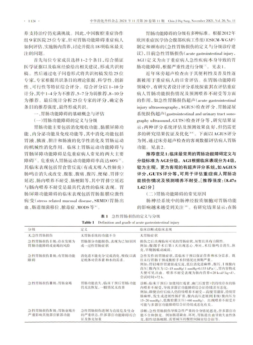 中华消化外科杂志2021年11月第20卷第11期Chin J Dig Surg,November2021.Vl.20.No.11·1123·指南与共识重症病人胃肠功能障碍肠内营养专家共识(2021版)亚洲急危重症协会中国腹腔重症协作组通信作者:蒋正英,重庆大学附属肿瘤医院重症医学科,重庆400030,Email:zhengyingjiange@cqu.edu.cn;常志刚,北京医院外科重症医学科,北京100730,Email:zhigangchang@126.com:李维勤,中国人民解放军东部战区总医院重症医学科,南京210002,Email:liweiqindr@vip.163.com【摘要】重症病人早期肠内营养至关重要,然而其临床实践仍充满挑战。中国腹腔重症协作组9家医院25位专家,针对重症病人胃肠功能障碍的病因及评估,早期肠内营养实施策略,以及各种临床实践中的具体方案进行讨论,并提出18项临床最为关注的问题,综合循证医学证据及临床经验,最终制订该共识,旨在为临床医师提供参考及指导,以期改善病人预后。【关键词】胃肠疾病:胃肠功能障碍:重症疾病:肠内营养;专家共识Expert consensus on enteral nutrition for gastrointestinal dysfunction in critically ill patients(2021 edition)Chinese Abdominal Intensive Care Association,Asia Society for Emergency and Critical Care MedicineCorresponding authors:Jiang Zhengying,Intensive Care Unit,Chongqing University Cancer Hospital,Chongqing 400030,China,Email:zhengyingjiang @cqu.edu.cn;Chang Zhigang,Department of SurgicalIntensive Care Unit,Beijing Hospital,Beijing 100730,China,Email:zhigangchang@126.com;Li Weiqin,Intensive Care Unit,General Hospital of Eastern Theater Command,Nanjing 210002,China,Email:liweiqindr@vip.163.comAbstract Early enteral nutrition plays an important role in the management of criticallyill patients,while there is still full of challenges in clinical practice.Twenty-five experts from9 hospitals of the Chinese Abdominal Intensive Care Association discussed and proposed 18 criticalissues of concern by clinicians,including causes,definitions,and evaluation of gastrointestinaldysfunction in critically ill patients,as well as principles and strategies on how to implement enteralnutrition in various clinical scenarios.Based on medical evidences as well as experts'clinical experi-ences,this expert consensus was finally developed,hoping to provide guidance for clinical practiceand improve outcome of patients.Key words Gastrointestinal diseases;Gastrointestinal dysfunction;Critical illness;Enteral nutrition;Expert consensus目前重症病人营养支持治疗相关指南及共识合,缩短机械通气时间、ICU住院时间和总体住院推荐危重症病人入住1CU24~48h内尽早启动肠内时间,以及降低病死率有关4。然而在临床实践营养2。肠内营养有助于营养胃肠黏膜,增强神中,由于ICU病人的个体差异性较大,不同病种或经内分泌功能,有益于保留肠道黏膜屏障功能和免病程病人胃肠功能受损程度不同、对肠内营养的耐疫功能。早期肠内营养与降低感染率,加速伤口愈受性差异很大,胃肠功能障碍重症病人开展肠内营D0I:10.3760/emaj.cm115610-20211012-00497收稿日期2021-10-12引用本文:亚洲急危重症协会中国腹腔重症协作组,重症病人胃肠功能障碍肠内营养专家共识(2021版)▣.中华消化外科杂志,2021,20111123-1136.D0:10.3760/cmaj.cnl115610-20211012-00497.