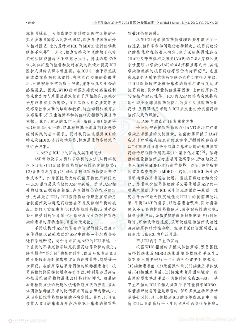 中华医学杂志2019年7月2日第99卷第25期Natl Med J China.July2.2019.Vol.99.No.25·1945.专题论坛:重定基本问题重症监护病房多重耐药菌防控:指南与实践余跃天'马朋林2·上海交通大学医学院附属仁济医院重症医学科,上海200025;2解放军总医院第八医学中心SCU,北京100091通信作者:马朋林,Email:mapenglin1(@l63.comPrevention and control of multidrug-resistant organisms:guidelines vs practiceYu Yuetian,Ma PenglinIntensive Care Unit,Renji Hospital,Shanghai Jiaotong University School of Medicine,Shanghai 200025,China;2SICU,the 8th Medical Center of Chinese PLA General Hospital,Beijing 100091,ChinaCorresponding author:Ma Penglin,Email:mapenglinl@163.com【摘要】多重耐药菌(MDRO)感染对危重患者构成越来越大的威胁。WHO相关防控指南指出手卫生、主动筛查、接触隔离等感染控制措施可以阻断MDRO的传播,而抗菌药物管理是减少MDRO出现的重要工具。本文将指南推荐意见与1CU内感控措施具体执行间存在的差距进行分析,以期推动感控措施在ICU内的执行,进一步降低ICU内MDRO相关感染的发生率。【关键词】多重耐药菌;重症监护病房;防控;指南D01:10.3760/cmaj.issn.0376-2491.2019.25.008抗菌药物耐药已成为影响重症感染患者预后抗菌药物管理项目(ASP)是提高医疗质量和减少最重要的决定因素之一。美国每年发生70多万例MDRO出现及传播的重要工具。尽管MDRO感染医疗保健相关性感染,很大部分由多重耐药病原菌给现有抗菌药物治疗带来了巨大挑战,但ICU的医(MDR0)引起,而其中近半数发生于危重症患者。护人员可通过优化已知有效的基本措施来遏制其在欧洲,产碳青霉烯酶肠杆菌科细菌的流行也使得传播。本文主要根据我国国情及ICU特点,分析抗菌药物耐药率大幅上升,最终导致了住院患者尤WHO防控指南在ICU内具体实施的可行性及有效其是重症监护病房(ICU)患者相关感染的发病率、性,以期推动感控措施在ICU内的执行,进一步降病死率和治疗费用增加。中国2018年细菌耐药监低ICU内MDRO相关感染的发生率。测网(CHINET)数据表明,我国耐碳青霉烯铜绿假一、发展中国家的ICU如何实施多模式干预单胞菌、肺炎克雷伯菌及鲍曼不动杆菌检出率分别策略是23.6%、24.9%及66.7%,且样本多数来源于ICUMDRO感染预防和控制是提高ICU医疗质量送检标本。的必要条件。发达国家由于组织机构完善,在为预防和控制此类MDRO在医疗机构内传播,20世纪50年代就具有相关的防控方案。然而,即近年来世界卫生组织(WHO)指南及我国专家共识使在这些国家,高达25%的CU患者至少会经历一相继颁布。在ICU病区,患者、医护人员及病房次医院获得性感染。同时,世界上75%的人口生活环境是MDRO传播的潜在源头,而ICU患者由于侵在发展中或中低收入国家,获得的医疗保健资源有入性设备、潜在疾病或药物引起的免疫损害、营养限。此外,发展中国家的医院感染率较高,造成不良、难以控制的血糖增高和脓毒症而极易受到50%以上的ICU患者受到感染威胁。RDO感染的影响。指南指出,手卫生、主动筛查、21世纪以来,许多国家制定了MDR0感控监接触隔离等感染控制措施可阻断MDRO的传播。测规划。然而,多模式干预策略在ICU内的具体实0ZxvdWRWZXzaw9uL0o7