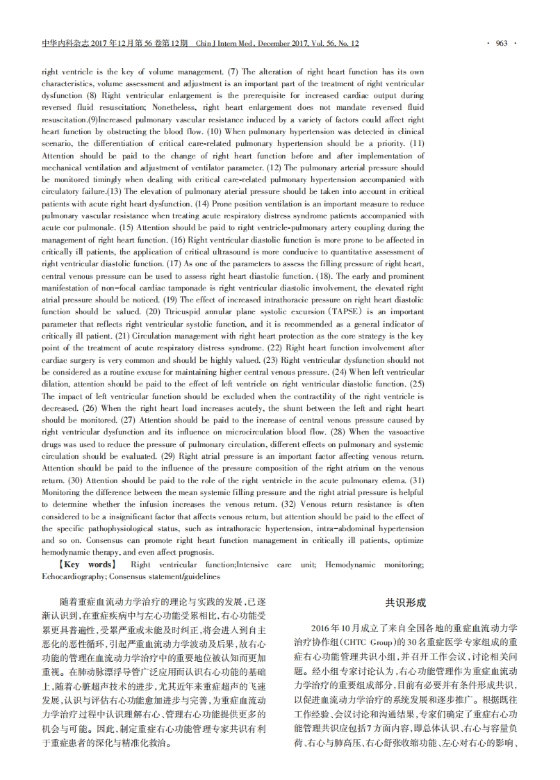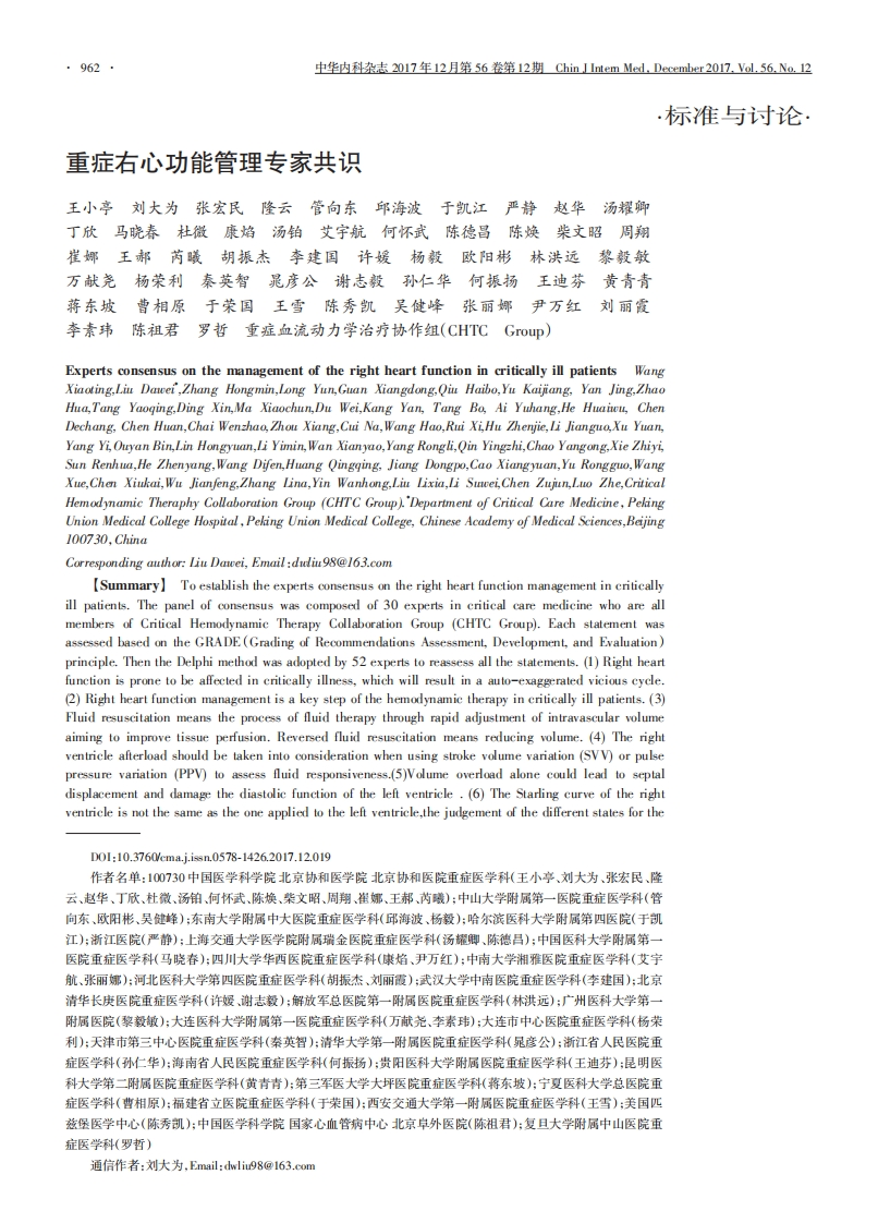 ·962·中华内科杂志2017年12月第56卷第12期Chin J Intem Med.December2017.Vdl.56.No.12.标准与讨论重症右心功能管理专家共识王小亭刘大为张宏民隆云管向东邱海波于凯江严静赵华汤耀卿丁欣马晓春杜微康焰汤铂艾宇航何怀武陈德昌陈焕柴文昭周翔崔娜王郝芮曦胡振杰李建国许媛杨毅欧阳彬林洪远黎毅敏万献尧杨荣利秦英智晁彦公谢志毅孙仁华何振扬王迪芬黄青青蒋东坡曹相原于荣国王雪陈秀凯吴健峰张丽娜尹万红刘丽霞李素玮陈祖君罗哲重症血流动力学治疗协作组(CHTC Group)Experts consensus on the management of the right heart function in critically ill patientsWangXiaoting,Liu Dawei,Zhang Hongmin,Long Yun,Guan Xiangdong,Qiu Haibo,Yu Kaijang,Yan Jing,ZhaoHua,Tang Yaoqing,Ding Xin,Ma Xiaochun,Du Wei,Kang Yan,Tang Bo,Ai Yuhang,He Huaiwu,ChenDechang,Chen Huan,Chai Wenzhao,Zhou Xiang,Cui Na,Wang Hao,Rui Xi,Hu Zhenjie,Li Jianguo,Xu Yuan,Yang Yi,Ouyan Bin,Lin Hongyuan,Li Yimin,Wan Xianyao,Yang Rongli,Qin Yingzhi,Chao Yangong,Xie Zhiyi,Sun Renhua,He Zhenyang,Wang Difen,Huang Qingqing,Jiang Dongpo,Cao Xiangyuan,Yu Rongguo,WangXue,Chen Xiukai,Wu Jianfeng,Zhang Lina,Yin Wanhong,Liu Lixia,Li Suwei,Chen Zujun,Luo Zhe,CriticalHemodynamic Theraphy Collaboration Group (CHTC Group).Department of Critical Care Medicine,PekingUnion Medical College Hospital,Peking Union Medical College,Chinese Academy of Medical Sciences,Beijing100730,ChinaCorresponding author:Liu Dawei,Email:duliu98@163.com[Summary]To establish the experts consensus on the right heart function management in criticallyill patients.The panel of consensus was composed of 30 experts in critical care medicine who are allmembers of Critical Hemodynamic Therapy Collaboration Group (CHTC Group).Each statement wasassessed based on the GRADE(Grading of Recommendations Assessment,Development,and Evaluation)principle.Then the Delphi method was adopted by 52 experts to reassess all the statements.(1)Right heartfunction is prone to be affected in critically illness,which will result in a auto-exaggerated vicious cycle.2)Right heart function management is a key step of the hemodynamic therapy in critically ill patients.(3)Fluid resuscitation means the process of fluid therapy through rapid adjustment of intravascular volumeaiming to improve tissue perfusion.Reversed fluid resuscitation means reducing volume.(4)The rightventricle afterload should be taken into consideration when using stroke volume variation (SVV)or pulsepressure variation (PPV)to assess fluid responsiveness.(5)Volume overload alone could lead to septaldisplacement and damage the diastolic function of the left ventricle (6)The Starling curve of the rightventricle is not the same as the one applied to the left ventricle,the judgement of the different states for theD01:10.3760Wcma.j.issn.0578-1426.2017.12.019作者名单:100730中国医学科学院北京协和医学院北京协和医院重症医学科(王小亭、刘大为、张宏民、隆云、赵华、丁欣、杜微、汤铂、何怀武、陈焕、柴文昭、周翔崔娜、王郝、芮曦):中山大学附属第一医院重症医学科(管向东、欧阳彬、吴健峰):东南大学附属中大医院重症医学科(邱海波、杨毅):哈尔滨医科大学附属第四医院(于凯江):浙江医院(严静):上海交通大学医学院附属瑞金医院重症医学科(汤耀卿、陈德昌):中国医科大学附属第一医院重症医学科(马晓春):四川大学华西医院重症医学科(康焰、尹万红):中南大学湘雅医院重症医学科(艾宇航、张丽娜):河北医科大学第四医院重症医学科(胡振杰、刘丽霞):武汉大学中南医院重症医学科(李建国):北京清华长庚医院重症医学科(许嫒、谢志毅):解放军,总医院第一附属医院重症医学科(林洪远):广州医科大学第一附属医院(黎毅敏):大连医科大学附属第一医院重症医学科(万献尧、李素玮):大连市中心医院重症医学科(杨荣利):天津市第三中心医院重症医学科(秦英智):清华大学第一附属医院重症医学科(晁彦公);浙江省人民医院重症医学
