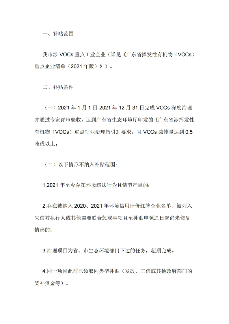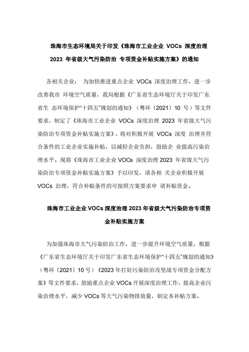 珠海市生态环境局关于印发《珠海市工业企业VOCs深度治理2023年省级大气污染防治专项资金补贴实施方案》的通知各相关企业:为加快推进重点企业VOCs深度治理工作,进一步改善我市环境空气质量,我局根据《广东省生态环境厅关于印发广东省生态环境保护“十四五”规划的通知》(粤环〔2021)10号)等文件要求,制定了《珠海市工业企业VOCs深度治理2023年省级大气污染防治专项资金补贴实施方案》,将对积极开展VOCs深度治理并符合条件的工业企业实施补贴,以减轻企业负担,鼓励企业提高污染治理水平。现将《珠海市工业企业VOCs深度治理2023年省级大气污染防治专项资金补贴实施方案》予以印发,请各相关企业积极开展VOCs治理,符合补贴条件的可按照方案要求申请补贴资金。珠海市工业企业VOCs深度治理2023年省级大气污染防治专项资金补贴实施方案为加强珠海市大气污染防治工作,进一步提升环境空气质量,根据《广东省生态环境厅关于印发广东省生态环境保护“十四五”规划的通知》(粤环〔2021)10号)《2023年打好污染防治攻坚战专项资金分配方案》等文件要求,鼓励重点企业VOCs开展深度治理工作,提高企业污染治理水平,减少VOC$等大气污染物排放量,制定本补贴方案。