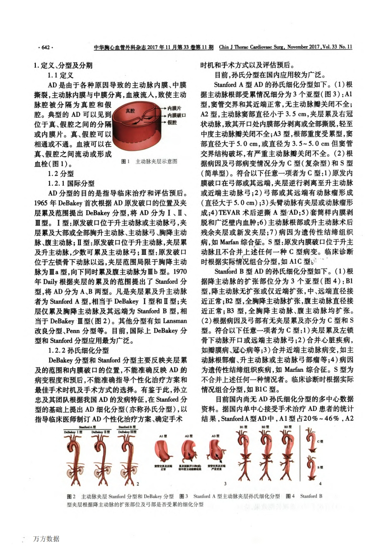 中华胸心血管外科杂志2017年1L月第33卷第11期Chin】Thorae Cardiovase Surg,November2017,Vcl.33No.11·641·专家共识·主动脉夹层诊断与治疗规范中国专家共识中国医师协会心血管外科分会大血管外科专业委员会通信作者:孙立忠Email:lizhongsun(@foxmail.comD01:10.3760/cma.j.issn.10014497.2017.11.001基金项目:国家科技支撑计划项目(2015BAI12B03),国家卫计委公益性行业科研专项(201402009)Chinese experts'consensus of standardized diagnosis and treatment for aortic dissection the Committee of Great Vessels ofChinese Assonciation f Cardioascular SurgeonsCorresponding author:Sun Lizhong Email:lizhongsun@foxmail.comFund program:The National Seience and Technology Support Program of China(2015BAI2B03),the Special ResearchFund for Public Welfare Industry from National Health and Family Planning Commission of China(201402009)主动脉夹层(aortic dissection,AD)是一种严重次再干预:(4)医疗水平发展不平衡,部分患者不能威胁国人生命健康的危重症心血管疾病。近年来,得到及时有效的诊治。因此,国内AD的诊疗策略随着医务人员对主动脉疾病认识的提高,以及影像不应完全照搬西方,制订符合我国国情的AD诊断诊断、心血管内外科、麻醉及体外循环技术的进步,和治疗规范变得尤为迫切。AD的诊出率不断提高,手术死亡及并发症发生率有鉴于此,依托国家卫计委公益性行业科研专明显下降。但由于目前国际上仍缺乏关于AD治疗项及国家科技支撑计划项目资助,专家委员会根据的大规模前瞻性随机对照研究,业内对于该疾病的最新临床研究成果,特别是基于中国患者的临床研诊断和治疗仍存在诸多争议。究,参考最新美国和欧洲等相关协会组织发布的指近20年来,为提高我国AD的诊疗效果,国内南和共识,并结合我国国情及临床实践,针对AD诊学者进行了诸多卓有成效的探索,使我国主动脉外疗策略组织了多轮Delphi法专家问卷函询和会议科事业迅速发展。例如:孙氏手术作为复杂A型讨论。最终,专家委员会对AD的诸多诊疗策略达AD的首选手术方法在全国推广;AD孙氏细化分型成共识。本共识提供的仅仅是AD的主要治疗原则的提出对选择手术时机、确定手术方案及初步判断和依据,帮助医师做出医疗决策,但在临床实践中医预后具有重要的指导意义;腔内修复术广泛应用于师应根据患者的病情制订个体化的诊疗方案。另B型AD的治疗;其他如分支支架血管置入术、杂交外,共识中提出的部分诊疗措施尚无充分的循证医手术等在AD的治疗中也取得了良好的效果。这些学证据支持,今后专家委员将定期对共识内容进行诊疗技术的发展极大丰富了我国AD的治疗手段,更新和完善。本共识中的推荐类别及证据分级采用但缺少相应的行业规范。国际通用方式表示(见表1)。为规范和指导主动脉疾病的临床诊疗,美国心表1本共识中的推荐类别和证据分级脏协会于2010年发布了胸主动脉疾病诊疗指南(AHA指南);欧洲心脏病协会最早于2001年发布推荐类别主动脉疾病诊疗指南(ESC指南),并于2014年对1类已证实和(或)一致公认有益,有用和有效的操作或治疗,该指南作出修订。上述指南对AD的诊新、治疗及推荐使用ia类有关证据和(或)观点领向于有效果,应用该操作或随访作出了相应的推荐。目前,我国AD的诊疗也治疗是适当的基本沿用上述指南,但国内尚无系统的AD诊疗规Ⅱb类有关证据和(或)观点尚不胞充分证明有效,需进一步研究Ⅲ类已证实和(或)一致公认某操作或治疗措范无用和(或)无效,范。然而,我国的社会经济水平及AD患者的特点井可能有害,不推荐使用与西方国家存在差异。与发达国家相比,我国AD证据分级诊疗存在以下特点:(1)病因以高血压为主,青壮年A级经多人群验证,数据来自多个随机临宋试验或荟苯分析B级经有限人群验证,数据来自单个随机临床试验、娄萃多,高血压的知晓率和控制率比发达国家低:(2)患分析或多项非随机对照研究者的平均年龄较发达国家低10~20岁,预期寿命C级仅经极有限人群监证,仅来自专家共识意见、病例研究或某治疗标准长;(3)首次手术应重视长期效果,应减少或避免二万方数据