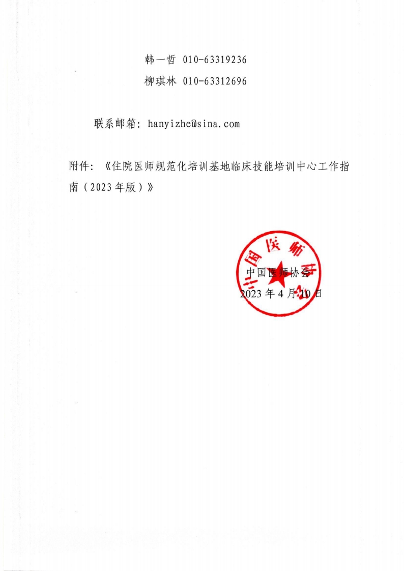 中国医师协会中国医师协会关于发布《住院医师规范化培训基地临床技能培训中心工作指南(2023年版)》的通知医协函〔2023]280号各住院医师规范化培训基地:为规范住院医师规范化培训基地临床技能培训中心工作,中国医师协会组织中国医师协会毕业后医学模拟教育专家委员会为核心牵头建立专家团队,在深入了解我国住院医正师规范化培训要求、结合医学模拟教育发展趋势的基础上,经过充分调研和反复讨论,形成了《住院医师规范化培训基地临床技能培训中心工作指南(2023年版)》(以下简称“指南”)。旨在指导我国住院医师规范化培训基地临床技能培训中心的建设及有效运行,充分发挥医学模拟技术手段在医学人才培养过程中的重要作用。现将本指南正式发布,各培训基地在使用过程中如有意见或建议,请及时反馈。联系方式:中国医师协会住培部:地址:北京市丰台区广安路9号5号楼10层邮编:100073