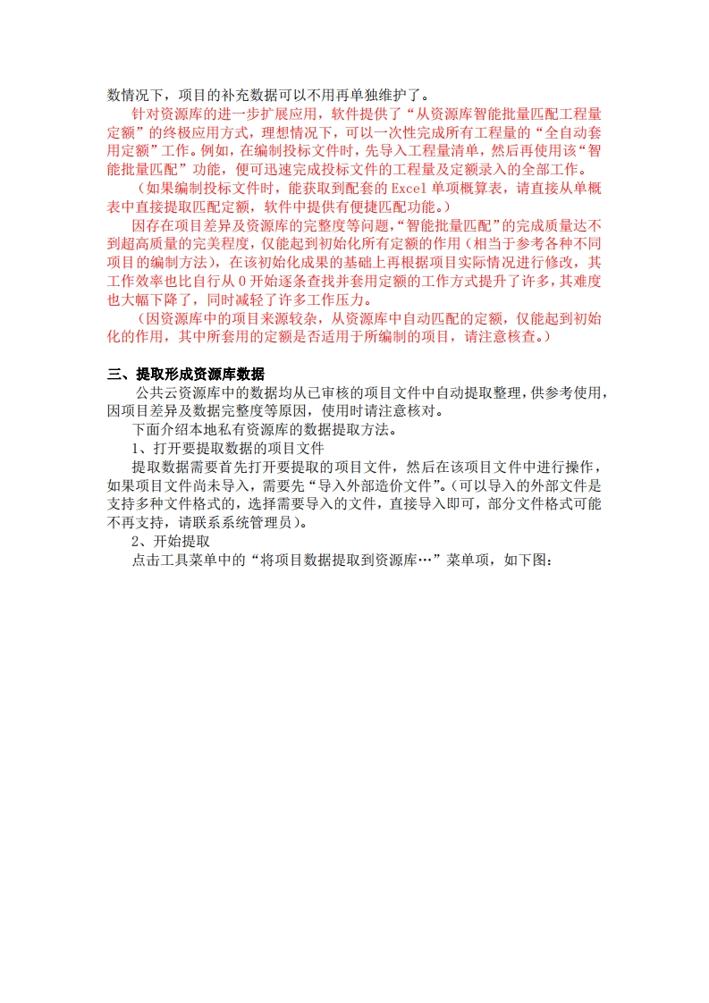 资源库及全自动套用定额(第三版)一、资源库划分资源库分为“公共云资源库”和“本地私有资源库”两部分。“公共云资源库”是部署在公网服务器上的,所有用户都可以自由访问,由软件开发商整理和维护。“本地私有资源库”是部署在用户私有的个人电脑或服务器上的,仅具备访问权限的用户自己(或同事等)才能访问,由用户自行整理维护。当软件的运行模式为“单机版”时,“本地私有资源库”部署在用户的个人电脑上,运行模式为“网络版”时,“本地私有资源库”部署在网络版设置中所指向的服务器上。使用资源库,并配合软件提供的智能匹配功能,可以最大程度利用以往已完成项目中的历史数据,减少不同项目文件编制时重复套用定额和补充方案等工作量,提升工作相率。尤其在编制投标报价文件时,再配以自动从exce1单概表匹配定额的功能,可将投标文件编制的工作效率提升95%以上。“公共云资源库”和“本地私有资源库”互为补充,考虑到不同用户及项目的习惯和差异等,在编制文件时,应优先使用“本地私有资源库”,“本地私有资源库”中无有效匹配内容时,再使用“公共云资源库”。除“公共云资源库”和“本地私有资源库”外,系统内置的标准定额库、材料库和机械台班库等,也可以作为标准资源库使用。在自动匹配套用定额过程中,当无法从“公共云资源库”或“本地私有资源库”中匹配到对应的定额时,系统可根据清单细目的名称,自动从标准定额库、材料库或机械台班库类查找对应的定额或材料等,且支持模糊查找(比如:清单名称“自卸汽车运土运距1km”可自动匹配到定额名称“自卸汽车运土运距≤1km”)。二、资源库简介资源库包含“关联定额块”、“补充定额”、“补充材料”、“补充机械”、“补充设备”共5个板块。“定额块”指的是特定的工程子目中所包含的一条或多条工序定额,每条定额包含基本的定额号、定额名称、定额单位、定额调整、工程量系数等内容。使用定额块,可一次性将工程子目下所包含的所有工序定额全部录入,并自动按工程量系数完成所有定额条目的工程量计算。随着资源库中“定额块”数据的不断补充和完善,在大多数情况下,以前传统的在工程子目下逐条查找套用定额并输入工程数量的方法,将逐步被“定额块”的批量方法所取代,或部分取代。使用“定额块”,可以将造价工作进行简化,并提升工作效率,而且对于造价新手尤其有用。对于资源库中“补充定额”、“补充材料”、“补充机械”和“补充设备”,可以直接将其当作项目补充数据使用,其使用方法和项目补充数据没有差异。在使用过程中,如果项目补充数据中不包含或没下载相同定额号或代号的补充数据,系统会将这些云数据先下载到项目补充数据中。随着云数据的不断积累和完善,多