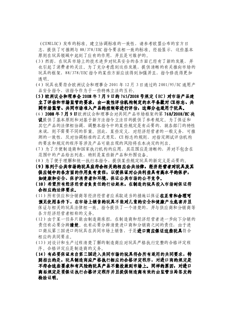 P6-TkPR0W2008)0626玩具安全I2008年12月18日关于玩具安全,对欧洲议会和理事会的建议,欧洲议会作出立法决定(C0M2008)0009-C6-0039/2008-2008/0018(C0d)(共同决定程序:1读)欧洲议会一考虑到委员会向欧洲议会和理事会提出的建议(C0M(2008)0009)-考虑到EC协定的251(2)条款和95条款,追溯到委员会向欧洲议会提出的建议(C6☐0039/2008),-考虑到EC协定程序规则中的51规则,-考虑到内部市场和保护消费者委员会的报告,环境、公共健康和食品安全的建议以及工业、科学和能源部门的建议(A6-0441/2008)1、赞同委员会修改的建议;2、如果打算修改建议或用其它条文代替,将再次拜访委员会向议会提交相关问题;3、对此注意委员会的陈述;4、指示议会主席向理事会和委员会转交议会的文件。P6-TC1-C0D(2008)00182008年12月18日采用一读时欧洲议会的观点,采用欧洲议会和理事会2009/:/EC玩具安全指冷的编号(EA关联文本)欧洲联盟的欧洲议会和理事会考虑到欧洲共同市场建立的协议,特别是95条款考虑到来自委员会的建议考虑到欧洲经济和社会委员会的观点考虑到地区委员会的观点按照协议251条款规定的程序的行为:如下:(1)1988年5月3日在成员国间关注的玩具安全理事会指令88/378/EEC法律在内部市场建立了法律背景,以便于提高玩具安全水平,并消除成员国间的贸易障碍。(2)88/378/EEC指令基于新方法原则,并在1985年5月7日的理事会决议中建立起了新方法的技术要求与标准相协调。因此建立了对玩具的最基本安全要求,包括机械物理性能、易燃性能、卫生和幅射性等特别安全要求。详细技术要求按照1998年6月22日欧洲议会和理事会98/34/EC指令规定的在技术标准和法规领域中的程序,采用欧洲标准化委员会(CE)和欧洲电子技术标准化委员会