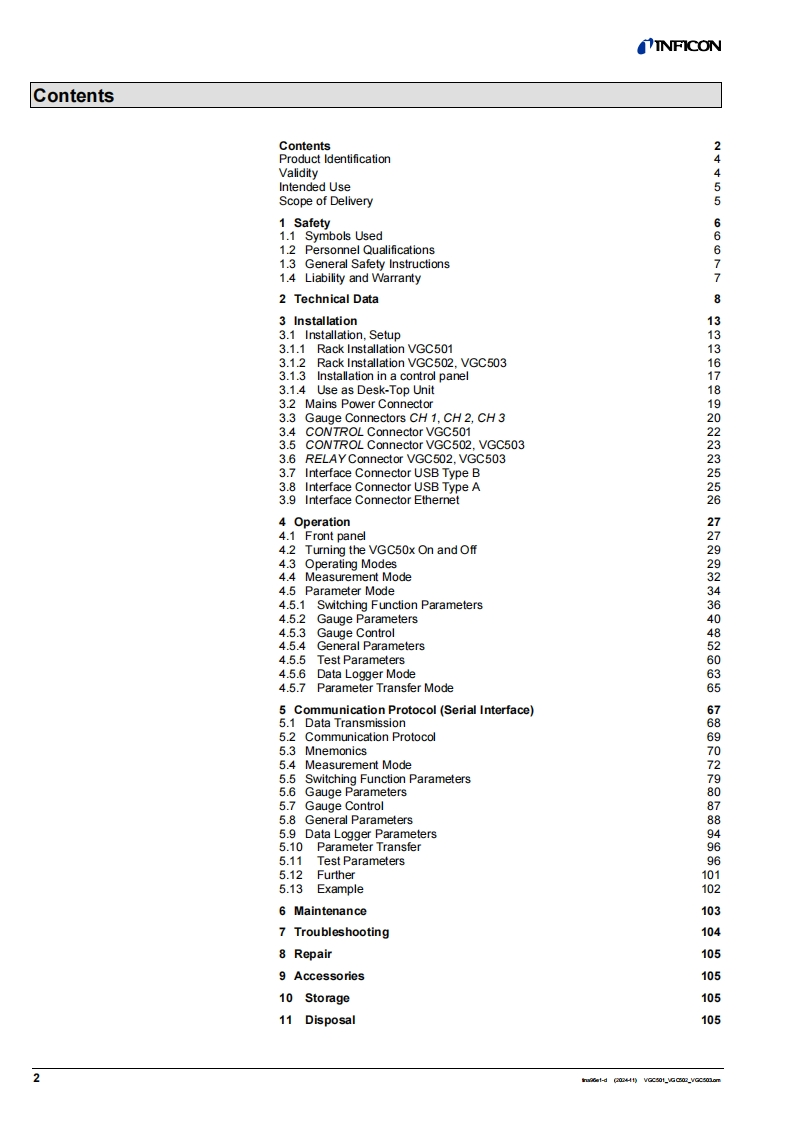 INFICONTNFICON Vacso1盖INFICON vacso22③R▣⊕☒同4INFICON vacso3可sb☑同4Operating ManualIncl.EU Declaration of ConformityVGC501,VGC502,VGC503Single-Channel,Two-Channel Three-Channel Control Unitstina96e1-d(2024-11)1