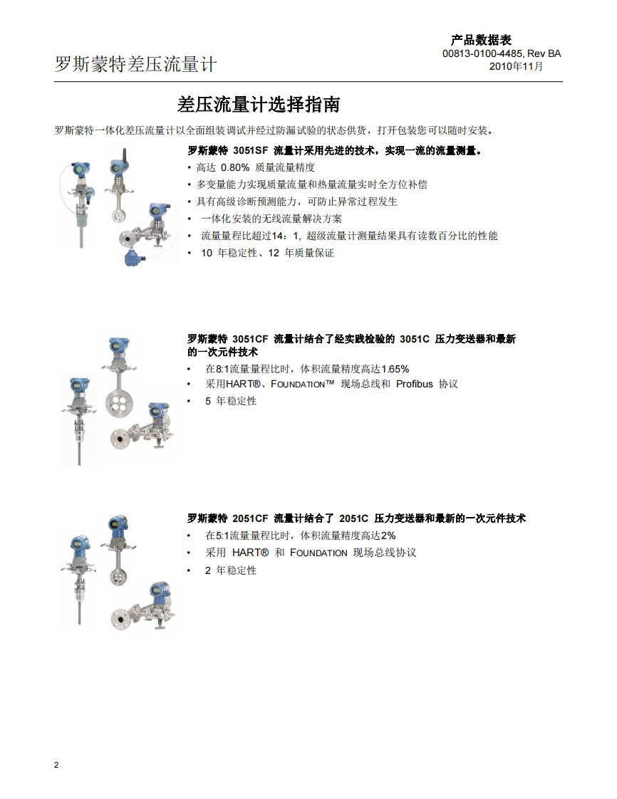 产品数据表00813-0106-4485,Rev BA2010年11月罗斯蒙特差压流量计罗斯蒙特差压流量计与一次元件·多变量能力实现质量流量和热量流量实时全方位补偿·全集成无线流量计实现轻松安装·采用Annubar@技术最大限度地减少永久压力损失,实现节能·采用调整型孔板技术,直管段仅需要上、下游直管段的2倍直径·通过内藏孔板技术提高小管线测量的精度和重复性目录差压流量计选择指南第2页订购信息、技术规格和产品认证罗斯蒙特3051SF流量计系列.第4页罗斯蒙特3051CF流量计系列..第41页罗斯蒙特2051CF流量计系列第67页罗斯蒙特485阿牛巴一次元件.第89页罗斯蒙特585阿牛巴一次元件.第96页罗斯蒙特405紧凑型一次元件.…第103页罗斯蒙特1595调整型孔板.第107页罗斯蒙特1195内藏孔板一次元件第110页罗斯蒙特1495孔板.…第114页罗斯蒙特1496孔板法兰.…第117页尺寸图…第124页安装和流量计朝向.第162页ROSEMOUNTEMERSON.www.rosemount.com