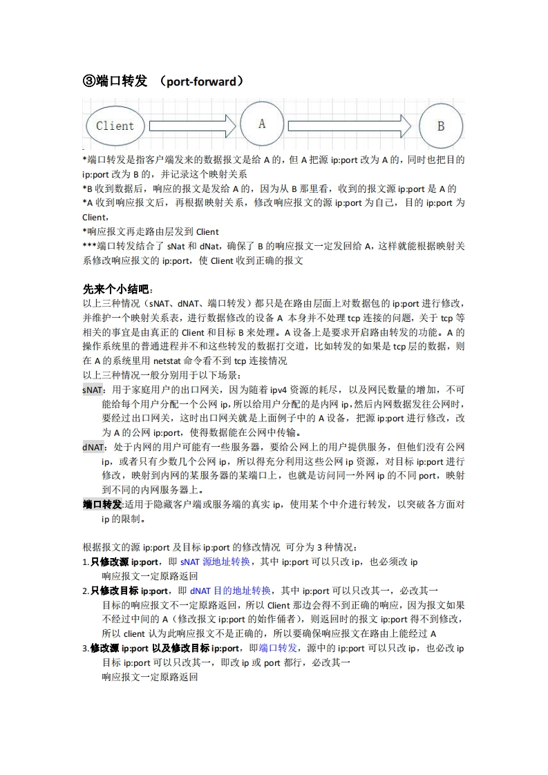 代理端口转发端口映射NAT概念释疑2NAT网络地址转换:这个概念最早用于路由器和防火墙等实体网络设备上,表示路由器/防火墙设备将收到的某数据包的p地址/传输层端口号进行修改,再走路由转发到目标主机。NAT最初只是指network address的转换,即ip地址,后来也可以修改传输层的端口号,涉及到端口号的修改的操作也叫作PAT(port address转换),但我们仍习惯于把这二者的修改统称为NAT。NAT是分2个方向的,对源ip:port的修改叫作sNAT(源地址转换),对目标ip:port的修改叫作dNAT(目的地址转换)①SNAT(源NAT)Client*sNAT是指客户端发来的数据报文是给B的,但在路由上经过了A设备,*然后A对这个流量的源ip:port做了修改,改成了A的ip:port,并且A记录了这个转换的映射关系,*B收到数据后,响应的报文是发回给A,因为从B那里看,数据的源p是A*A收到B发回的响应报文后,再根据之前保存的映射关系,把响应报文的目的ip:pot改为Client*最后响应报文走路由层发到Client②dNAT(目的NAT、端口映射)ClientB*dNAT如果强调对端口的修改,也可叫作端口映射*dNAT是指客户端发来的数据报文是给A的,但A把目的ip:port改为了B的,并记录这个转换的映射关系*B收到数据后,响应的报文是发给Client的,因为之前A并没有修改报文的源ip:port,所以从B那里看,报文就是从Client发来的。*B发回的响应报文经路由层转发,如果再经过A时,A再根据之前保存的映射关系,把响应报文的源ip:port改回A自己的*响应报文再走路由层发到Client*注意,如果B发回的响应报文经路由转发后,不经过A设备,则源ip:pot得不到修改,这样即使Client收到了响应报文,Client也不认这个报文,因为在tcp连接里,要求源ip:port和目的ip:port对得上,不然就不是同一个连接了。