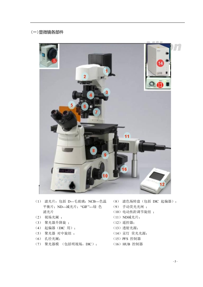 倒置荧光显微镜使用说明1、打开显微镜镜体开关、透射光源,再打开计算机,先开启相机电源,待稳定后再打开桌面软件。2、L100/E100分别代表相机/显微镜视野的切换。3、聚光器模(转盘):DICN1一10×20×普通物镜:DICN240×/60×/100×OIL普通物镜:ph1一10x20×相差物镜:ph240×60×相差物镜;ph3一100×相差(DIC模式只能用玻璃作为样品载体;ph模式下无限制)4、拍照时点击软件中相机图标(最好不用连续拍摄):保存图片:编辑→转换为8位RGB(若有其他标记则选嵌入叠加层8位RGB)→保存5、添加标尺:点击标尺图标→图片标尺处右键选择嵌入标度。(需先保存图片才能加标尺,添加标尺前确定显微镜上的物镜与软件上显示的物镜保持一致!)6、荧光样品观察步骤:打开荧光汞灯→关闭明场光源(显微镜上)→(遥控图标画)选择DICN2→打开荧光光闸→选择滤光块→点击自动曝光→调焦使图像清晰→选择强度照明调节荧光强弱(1最强,2为减弱12,以此类推)。(暂时不用荧光时点击关闸关闭光源;注意保护眼睛避免直视光源!)7、荧光汞灯寿命有限,避免频繁开关!使用30min以上才可关闭,2次使用间隔需在30min以上。8、微分干涉浮雕相称模式下,注意将起偏器推入光路中,观察样品时不断转动起偏器调整角度使图像清晰。9、油镜使用完毕后,用脱脂棉签蘸少许无水乙醇从中心点画圆往外擦拭。(脱脂棉签湿润即可,禁止将多余的水滴入镜头!)