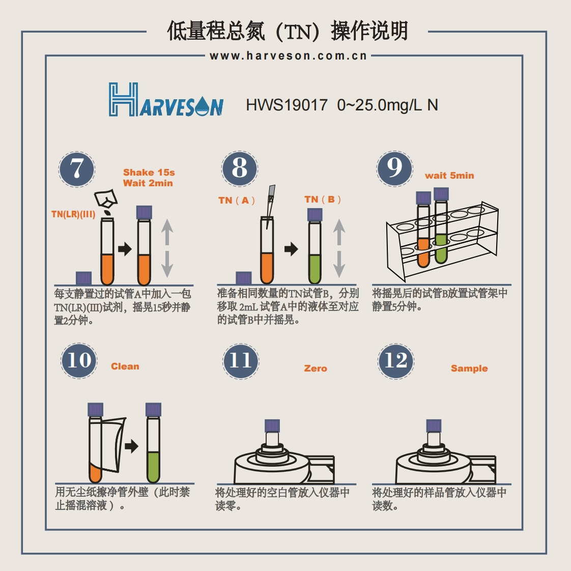 低量程总氮(TN)操作说明www.harveson.com.cn片ARVESNHWS190170~25.0mg/LN12mL2TN(LR)(I)3Clean/Shake取出2支T预制管A,其中一支对已加入空白和水样的试管中用无尘纸擦净管外壁,手执管盖加2mL超纯水作为空白值,另一分别加入一包TNLR)(I)试剂。颠倒摇匀预制管中溶液。支加2mL待测水样。4120°c/30mincoolShake 15sWait 3minTN(LR)(II)COD REACTOR回回回图打开消解仪,加热到120℃,设定将消解好的试管A放置试管架中每支冷却好的预制管A中加入一时间为30分钟,将两支待消解试冷却至室温。包TNLR)四试剂,摇晃15秒并管放入消解。静置3分钟。