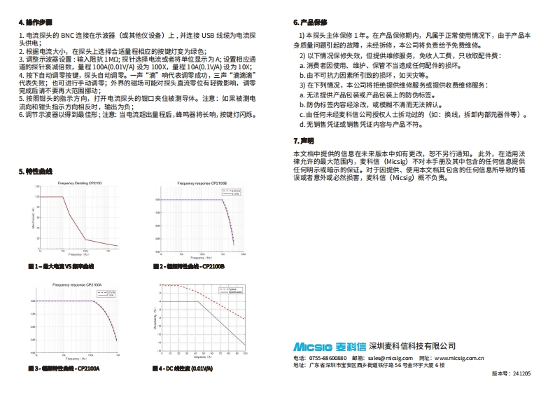 Mcse委科信平板示波器开创者光隔离探头引领者2产品规格◆微型号CP2100ACP2100B带师宽DC-800kHzDC-25MHz快速操作指南上升时阿≤4375n3≤140nB量程10M/100M低频交直流电流探头CP2100系列输出灵敏度Q.1V角10;0.01/A10003%±50mM(100值流精度典型4%±50mA100M,500mt-40如k)15%(100M,40M如k-100M)1.址证迟100B测量范围50mA-10Apk (10A)CP2100系列是一款可同时测量直流和交流的电流探头,采用分体式设计,外观小1A-100Mpk1000巧漂亮,使用标准BNC接口,适用于示波器,也可通过转接头适用于万用表。可测最大测量电流100Apk,70.7Arms (DC+AC pk)量最大电流为100Apk(70.7Am5);其分为2个型号,CP2100A可测量带宽范围DC-800KH比,CP2100B可测量带宽范围DC-2.5MHz,;有2个量程:10A和100A最大工作电压CAT I300V CAT II 600V可供选择。拥有自动和手动两种方式调零,采用USB供电,无需额外电源,让测量最大浮地电压CAT II300V CAT II 600V更加方便。常应用于电机驱动、工频、逆变器、电源、航空电子等领城。最大导体直证13mm过绿指际■蜂移长响,授灯闪姆供电DCSV便量2908单体包装重量1000g使用温度0-5rC使用湿度5%95%040℃,无超墙】5%65%(0℃-50℃,无】CE标准EN61010-2-032EMC标准EN61326-2013,EN613262-120133外观独九■aere量大号体童是m图C5V轴出图pCSV幢入