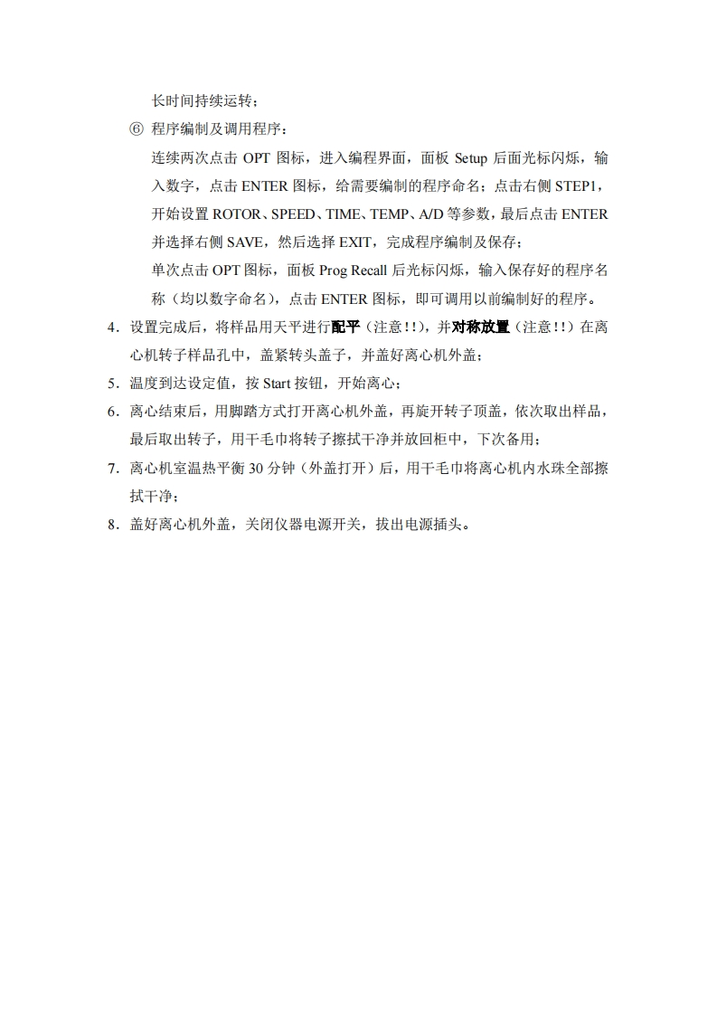 高速冷冻离心机简易操作流程1.仪器接通电源,打开仪器电源开关:2.打开离心机盖子,正确安装离心机转子:JA-25.50型号的转子直接放在轴上卡紧即可:JA-14型号转子卡口与离心机轴上卡槽对准(平行),平稳放下去卡紧即可:3.仪器运转参数设置:包括转子型号、转速、运转时间、温度、加/减速模式、保存编制的程序及调用编制好的程序:①转子种类设置:单次点击左侧ROTOR图标,右侧选择ROTOR类型和型号(本机两种型号:JA14和JA25.50),正确选择后点击ENTER图标:②转子转速设置:点击SPEED图标,右侧出现两种转子转速表示模式(转速RPM、离心力RCF):选择RPM,转速则以RPM表示,面板RPM前光标闪烁,输入设定数值(若输入有误,点击CE图标重新输入),确定输入正确,点击ENTER图标:选择RCF,面板RPM前光标闪烁,输入设定数值,确定输入正确,点击ENTER图标:③时间设置:点击左侧TME图标,右侧出现3种时间表示模式,选择HHMM,面板Time后光标闪烁,输入数字,点击ENTER图标,设置运行时间;选择HOLD,点击ENTER图标,表示离心机长时间持续运转:④温度设置:点击左侧TEMP图标,控制面板Temp后光标闪烁,输入温度设定值,点击ENTER图标:⑤加速/减速设置:单击左侧AD图标进行加速设置一右侧出现3种选择(MAX、SLOW、TME),选择MAX表示转子转速从0以最快速度增加到设定值:选择SLOW表示转子转速从0以较慢的速度增加到设定值:选择TIME表示转子转速在预订的时间内从0增加到设定值:双击左侧AD图标进行减速设置一右侧出现4种选择(MAX、SLOW、TIME、OFF),选择MAX表示转子转速从设定值以最快速度降到O:选择SLOW表示转子转速从设定值以较慢的速度降到0:选择TME表示转子转速在规定的时间内从设定值降到O:选择OF℉,表示减速关闭,机器