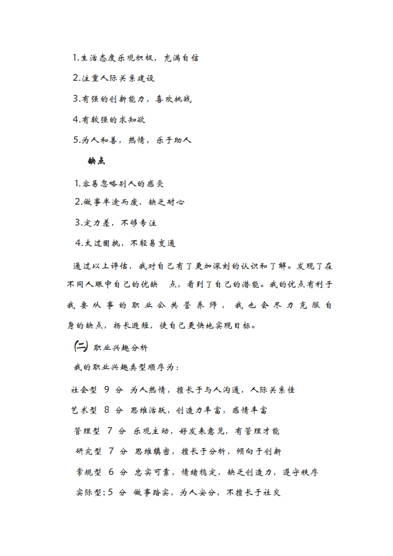 农检专业火学生职业生涯规划当我每天面对洋溢着笑容的人们时,我也会情不自禁的对自己微笑。随着科技的快速发展,人们的生话水平不断提高,更多的人开始享受生话,努力地使自己的每一天过得充实而快乐。但我们同时也看到,很多人不注重食品的营养需求和合理搭配,肥胖症、糖尿病等营养类疾病的发病率不新增加,越来越多的人受到食品营养的困扰。作为一名农产品以及食品专业的学生,我有责任为人们的健康、快乐而努力。民以食为天。当我看到人们在食物面前犹豫徘徊时,我懂得了食品营养与安全的重要性,我想通过学习和研究各类食品的营养价值,为人们制定合理的膳食指南和营养搭配,让人们吃得安全,吃得放心,使更少的人因食品而烦恼,快乐饮食,快乐生话。因此我的职业目标是成为一名公共营养师,为人们提供食品营养方面的咨询性服务,使人们的饮食更加科学,更加合理。我相信,当有一天每个人都能吃到安全且合理的食物时,我会仰起笑脸,从从容容,在喧闹的社会中,找到属于自己的一片天空。一、自我认知人最准的,就是认识自己,人总是能把别人看的很透彻,却很难看清自己。当我静下心来一遍一遍地剖析自己时,我看到,一个真真正正的我在向自己走来。自我评估:优点