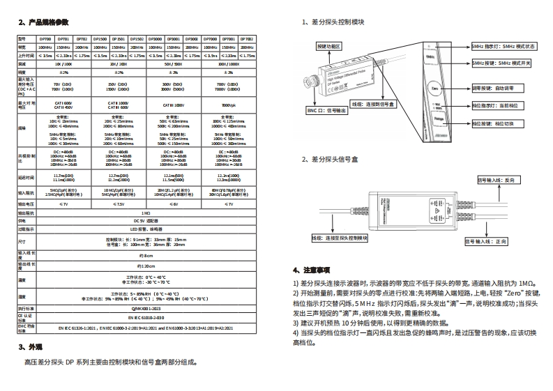 5、绿作步潭M小csG麦科信平板示波器开创者光隔离探头引领者)得头供电:使用标配适配器给差分探头供电;2)连幢示波■:将探头BNC接口与示波器通道输入相连(注意请确认示波器接地正常);快速操作指南3)遗狮墙位:根据被测电压范围选择合适的电压档位;高压差分探头DP系列4连擅被测树律:将信号输入线连接(使用测试夹或者测试钩)至被测对象开始测量;带宽:100MHz/150MHz/200MHz如果产生过压报警,请立即断开电源和输入;1、挥述月般量示波■:将示波器输入阻抗设为1M,通道衰减比与探头档位词至一致,调节合适的垂直档位与时基观察信号。麦科信(MiC5ig高压若分探头DP系列带宽范围从1O0MHz到500MHz,若分电·注意:在测量时应尽量不要使用输入延长线,否则会引入更多的保声,如果必须要压测试最高达7000Vpk基于光隔离禄头的引领技术,DP系列探头具有超任底噪,额外加长输入线,则应保证延长线的长度相同且进行双纹操作,而且输入频率不超过优秀的幅频特性和业界领先的共模抑制比。5MH也,如果超过5MHz输出会有一定的误差。DP系列采用标准BNC接口,适配所有品牌示波器;主机采用金属材质,抗干扰能6产品保修力更强,产品仅2CM厚度,设计小巧精美,一键秒速调零设计,过载保护报警,档1)本差分探头主体保修1年。在产品保修期内,凡属于正常使用情况下,由于产品位断电保存,精度%,不同测试电压提供最佳的双量程选择;采用高阻设计,满足本身质量问题引起的故障,未经拆修,本公司将负贵给予免费维修。多种安规测试要求;5MHz带宽限功能,有效滤除高频燥声和干扰,准确高速地)以下情况保修失效,但提供维修服务,免收人工费,只收取配件费:测量差分电压信号,满足开关电源、各种高频高压浮地或隔离信号等多样化的测à.消费者因使用、维护、保管不当造成任何配件的损坏。试测量需求。b.由不可抗力因素所引致的损坏,如天灾等。3引在下列情况,本公司将拒绝提供维修服务或提供收贵维修服务:a.无法提供产品包装或产品包装上的防伪标签。b.防伪标盗内容经涂改,或模糊不清而无法辨认。℃.由任何未经麦科信公司授权人士拆动过的(如:换线,拆卸内部元器件等)。时之a0ed.无销售凭证或销售凭证内容与产品不符。ce回☒7、安全事项)非专业人员请勿打开产品外壳2)请勿在产品外壳打开情况下使用3引测量时,请勿触碰任何裸露的金属4)当过载报警时,请立即断开电源和输入)请勿在易燃易爆环境下使用M℃s1口麦科信深圳麦科信科技有限公司电i话:0755-89300880邮箱:5aes@micsig如m网址:www.migc0m地址:广东省深圳市宝安区西乡街道铁仔路巧号金环字大夏6樱板本号:241204