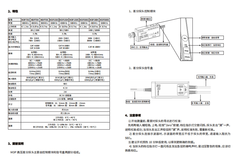 5、绿作步潭Micsig1)得头供电:使用标配USB Type-C线将法分探头连接至示波器USB接口进行供电;)连幢示波悬:将探头BNC接口与示波器通道输入相连(注意请确认示波器接地正常);高压差分探头快速操作指南3)遗狮墙位:根据被测电压范围选择合适的电压档位;4)连擅被测时律:将信号输入线连接(使用测试夹或者测试钩)至被测对象开始测量MDP系列(300-500MHz)如果产生过压报警,请立即断开电源和输入;5Q量示波■:将示波器输入阻抗设为50,调节合适的垂直档位与时基观察信号。·注意:在测量时应尽量不要使用输入延长线,否则会引入更多的燥声。如果必须要1、抓谜额外加长输入线,则应保证延长线的长度相同且进行双纹操作,而且输入频率不超过基于光隔离探头技术重新定义的MDP系列高压差分探头,具有超低底燥,优秀的幅5MH也,如果超过5MHz输出会有一定的误差。频特性和业界更高的共模抑制比,助力您轻松应对格种高频高压信号测试。MDP系列高正差分探头具有以下特点:高带宽、一键词零功能,过压报警功能,3000V6产品保棒最大差分输入电压,通用BNC接口,支持USB供电,超小的体积及精致的外观。1)本差分探头主体保修1年。在产品保修期内,凡属于正常使用情况下,由于产品本身质量问题引起的故障,未经拆修,本公司将负责给予免费维修。)以下情况保修失效,但提供维修服务,免收人工费,只收取配件费:a.消费者因使用、维护、保管不当造成任何配件的损坏。cE0e里b.由不可抗力因素所引致的损环,如天灾等。3引在下列情况,本公司将拒绝提供维修服务或提供收费维修服务:a.无法提供产品包装或产品包装上的防伪标蓝。b.防伪标盗内容经涂改,或模糊不清而无法辨认。℃.由任何未经麦科信公司授权人士拆动过的(如:换线,拆卸内部元器件等)。d.无销售凭证或销售凭证内容与产品不符。7、史全事项)非专业人员请勿打开产品外壳)请勿在产品外壳打开情况下使用3引测量时,请勿触碰任何裸露的金属4)当过载报警时,请立即断开电源和输入)请勿在易燃易爆环境下使用Micsig深圳麦科信科技有限公司电话:0755-88600880邮箱:sales(@micsig.com网址:ww.micsig.com.cn深圳市宝安区西乡街道南昌社区航城大道华丰国际机器人产业园A栋一楼