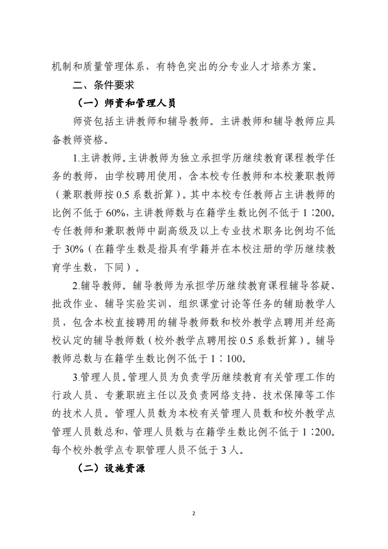 附件1普通高等学校学历继续教育办学基本要求(试行)普通高等学校学历继续教育办学基本要求包括办学方向、办学定位、制度机制等总体要求,师资和管理人员、设施资源、经费投入等条件要求,以及具体工作要求。办学基本要求是有关部门对所属高校学历继续教育核定办学资质、确定招生计划上限、监测办学质量、评价办学水平的重要依据。具体如下:一、总体要求(一)坚持党的全面领导。坚持高校党委对学历继续教育的全面领导,全面贯彻党的教育方针,坚持社会主义办学方向,服务国家和区域发展战略,助力学习型社会和服务全民终身学习教育体系建设。(二)落实立德树人根本任务。把思想政治教育贯穿人才培养全过程,突出党的创新理论最新成果,适应学生在职特点,拓宽育人途径,思政课程与课程思政有效衔接,将思想政治教育融入人才培养各环节。(三)明确办学定位。明确学校举办学历继续教育的办学定位,制定学历继续教育发展规划,并纳入学校整体发展规划和大学章程。学历继续教育工作纳入学校党委、行政议事议程。(四)建立完善的制度机制。有完整的学历继续教育制度1