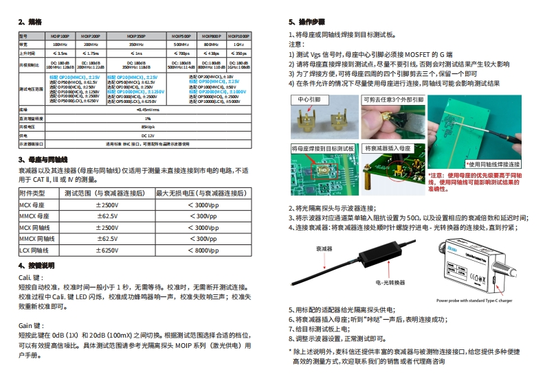 McsG麦科信平板示波器开创者光隔离探头引领者6生咖事项若发现测量结果与预朋偏法较大:a.请注意检查示波器输入阻抗是否设置为500快速操作指南b.尝试按Cali.键进行校准(无需断开测试连接)SigOFIT■光隔离探头MOIP系列激光供电)℃.测量时应尽可能使用母座直接焊接到测试点,不要引线,否则会对测试结果产生较大影响1、量述过压提醒:基于独家Sg0F开"技术的光隔离探头,拥有极高的共模抑制比和隔离电压,在其当Gain键LED灯快闪,且蜂鸿器发出急促的“滴滴滴滴”声时,说明输入电带宽范围内洞见信号的全部真相,是判定其他电压禄头所测信号真实性的终极裁判压超量程,请更换其他合适的袁减器进行测试。此外,Sg0FT光隔离绿头采用先进的激光供电技术,完美解决了隔离供电的问题。过热提醒:当蜂鸣器每2秒发出“滴滴”的声音时,说明光-电还原器温度过热,请检查光-电还原器敝热口是否被堵塞。7、产品保维本产品提供一对一专属技术支特服务。光隔离探头主体保修1年(支持购买延保)。光隔离探头包含高质量部件,应小心对待,光纤电缆的损坏不在保修范围内附带配件(衰减器)属于赠品,不参与保修。在产品保修朋内,凡属于正常使用情况下,由于产品本身质量问题引起的故障,未经拆修,本公司将负责给予免费维修。以下情况保修失效,但提供维修服务,免收人工费,只收取配件费:a.消费者因使用、维护、保管不当造成任何配件的损坏。b.由不可抗力因素所引致的损坏,如天灾等。在下列情况,本公司将拒绝提供维修服务或提供收费维修服务:▣*a.由任何未经麦科信公司授权人士拆动过的(如:换线,拆卸内部元器件等。扫码现看基本操作与注意事项视频b.无销售凭证或销售凭证内容与产品不符。警告·请勿堵塞光·电还原器散热口,否则可能会导致探头过热损坏。M℃S引G深圳麦科信科技有限公司·光纤折弯半径不得少于8cm,否则会导致光纤折断。·拆卸与移动探头时,请用手握特探头主体,切伽提拽光缆,避免光缓受外力拉扯电话:0755.8g300880邮箱:5as@micg-如m网址:www.micsig.o0mm地址:广东省深圳市宝安区西乡街道铁仔路药号金环字大夏6楼折断。