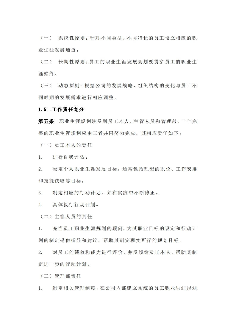 员工职业生涯规划制度第一章总则1.1目的和依据第一条为了充分、合理、有效地利用公司内部的人力资源,实现公司人力资源需求和员工个人职业生涯需求之间的平衡:对人力资源的开发与管理进行深化与发展,最大限度地发掘本公司的人才:规划公司员工的职业生涯发展,使员工发展与组织与公司发展保持一致。依据公司的有关规定,制定本管理制度。1.2相关释义第二条职业生涯规划与管理,是指个人发展和企业相结合,对决定员工职业生涯的主客观因素进行分析、总结和测定,并通过设计、规划、执行、评估和反馈,使每位员工的职业生涯目标与公司发展的战略目标相一致。职业生涯规划与管理包括两个方面:一方面是员工的职业生涯发展自我规划管理,员工是自己的主人,自我规划管理是职业发展成功的关键:另一方面是公司协助员工规划其生涯发展,并为员工提供必要的教育、培训、轮岗等发展的机会,促进员工职业生涯目标的实现。1.3适用范围第三条本管理办法适用于公司全体员工。1.4基本原则第四条员工的职业生涯规划应遵循以下原则:
