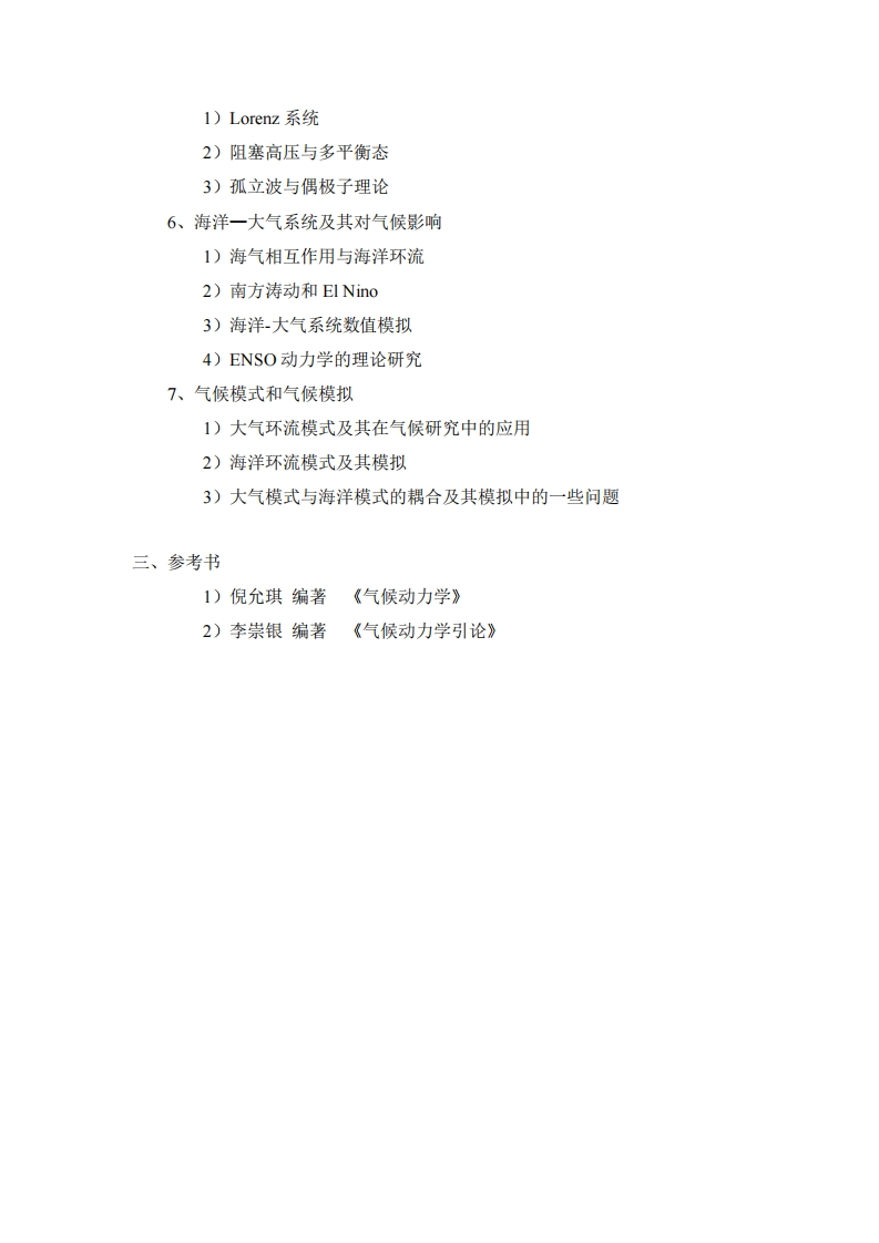 《气候动力学》复习大纲一、要求重点要抓气候动力学中的基本概念和对基本概念的理解,以及气候动力学中的基本科学问题及其相应的研究结果。二、复习内容1、气候系统1)气候系统及其物理约束2)气候系统的分析和诊断2、大气中的低频振荡和遥相关1)全球大气遥相关特征及其与低频振荡的关系2)季节内振荡的全球特征3)几种重要的低频指数(如SOL,Nino3,AO,NAO等)的定义及其物理意义4)产生低频振荡的机制3、中纬对流层大气中定常和准定常波动传播理论1)球面两维Rossby波的传播一大圆理论2)Rossby波纬向传播和径向传播的特征与性质比较3)Rossby波的垂直传播4)大气对外强迫(热力和地形)的响应5)大气遥相关型的正压不稳定理论4、波与平均气流的相互作用1)描述平均运动的基本方程2)EP通量和波作用量3)Eliassen-Palm剖面图4)地转非加速原理5)极地平流层爆发性增温与赤道平流层低层准两年振荡6)水平的瞬变涡旋通量对时间平均气流的净局地影响5、大气环流持续异常一非线性动力学研究