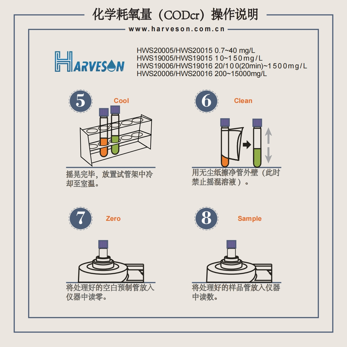 化学耗氧量(CODcr)操作说明www.harveson.com.cnHWS20005/HWS200150.7~40mg/L片ARVES NHWS19005/HWS1901510~150mg/LHWS19006/HWS1901620/100(20min)~1500mg/LHWS20006/HWS20016200~15000mg/L2mL/0.2mLClean/Shake取两支CoD预制管,一支加入2mL用无尘纸擦净管外壁,手执管盖去离子水(做空白值)另外一支颠倒摇匀预制管中溶液。加入2mL待测水样。*200-15000mg/L试剂加入0.2mL去离子水和待测水样。3165°C/20min150°C/2hShakeCOD REACTOR回回四回母将预制管放入消解仪中,在165℃在预制管还有余热时,将预制管上下消解20分钟或150℃下消解2小时,下颠倒几次,摇匀预制管中溶液。消解仪需预热。