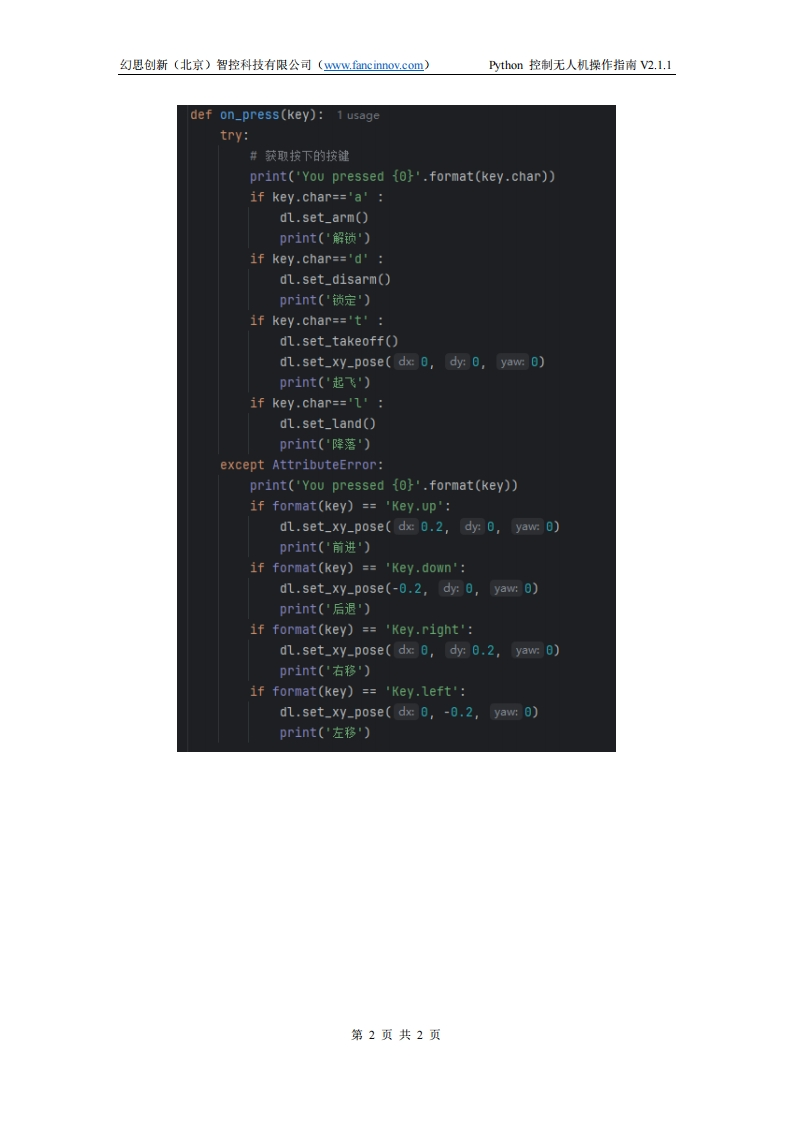 幻思创新(北京)智控科技有限公司(www.fancinnov.com)Python控制无人机操作指南V2.1.1幻思创新一Python控制无人机操作指南注:如遇无法解决的问题,请联系幻思创新的工程师寻求协助。系统版本UBUNTU版本20.04/Windows-+pycharm(或者python自带的编辑器IDLE)Python版本3.8.10环境配置sudo apt install python.3-pip(该指令仅适用于Ubuntu环境,Windows环境无需运行)pip install pynput运行(1)电脑连接无人机Wi-Fi(名称:Mik-xxxx,Xxxx为纯数字)(2)终端运行以下命令:python datalink_wifi.py python3 datalink_wifi.py用键盘控制无人机指令如下:第1页共2页