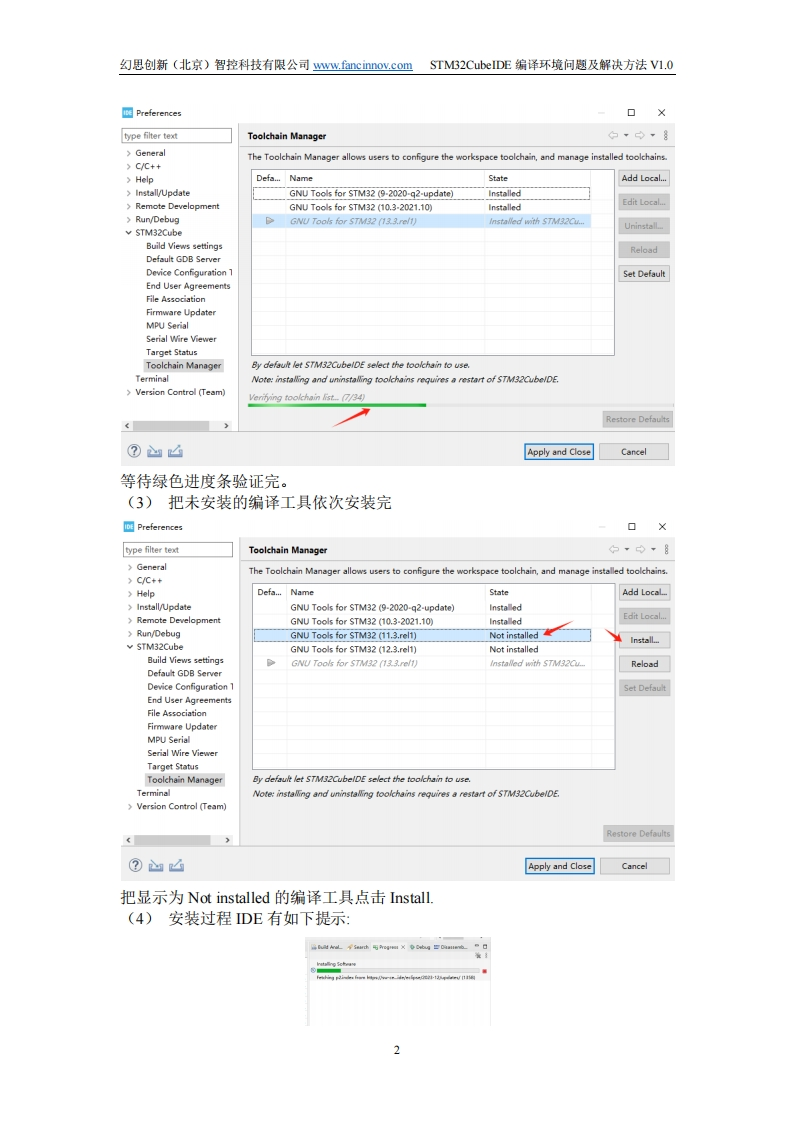 幻.思创新(北京)智控科技有限公司www.fancinnov..com STMB2 CubeIDE编译环境问题及解决方法V1.0STM32 CubeIDE编译环境问题及解决方法如何安装与工程相匹配的交叉编译工具链:(1)右键点击工程名,选择Properties弹出属性选项卡,打开配置界面:AguiteBuildersC/C++BuildConfiguration:Debug ActiveManage Configurations.Build VariablesEnvironmentJSON Compilation DatTool SettingsBuild Steps Build Artifact Binary Parsers Error ParsersLoggingSettings◆MCU/MPU ToolchainSelect what toolchain to useMCU/MPU SettingsUse workspace setting (GNU Tools for STM32 (13.3.r>C/C++GeneralMCU/MPU Post build outputsCMSIS-SVD SettingsFixed GNU Tools for STM32(13.3.rel1)MCU GCC AssemblerProject ReferencesGeneralRun/Debug SettingsToolchain Manager》DebuggingConfigure the workspace toolchain,and manage installePreprocessorInclude pathsOpen Toolchain Manager-Miscellaneousv③MCU GCC CompilerGeneralDebuggingPreprocessorInclude pathsOptimization②WarningsMiscellaneousMCU G++CompilerGeneral》DebuggingPreprocessorInclude pathsOptimization号Warnings号MiscellaneousMCU G++LinkerGeneralLibrariesMiscellaneous《Restore DefaultsApply⑦③Apply and CloseCancel(2)点击open Toolchain Manager1