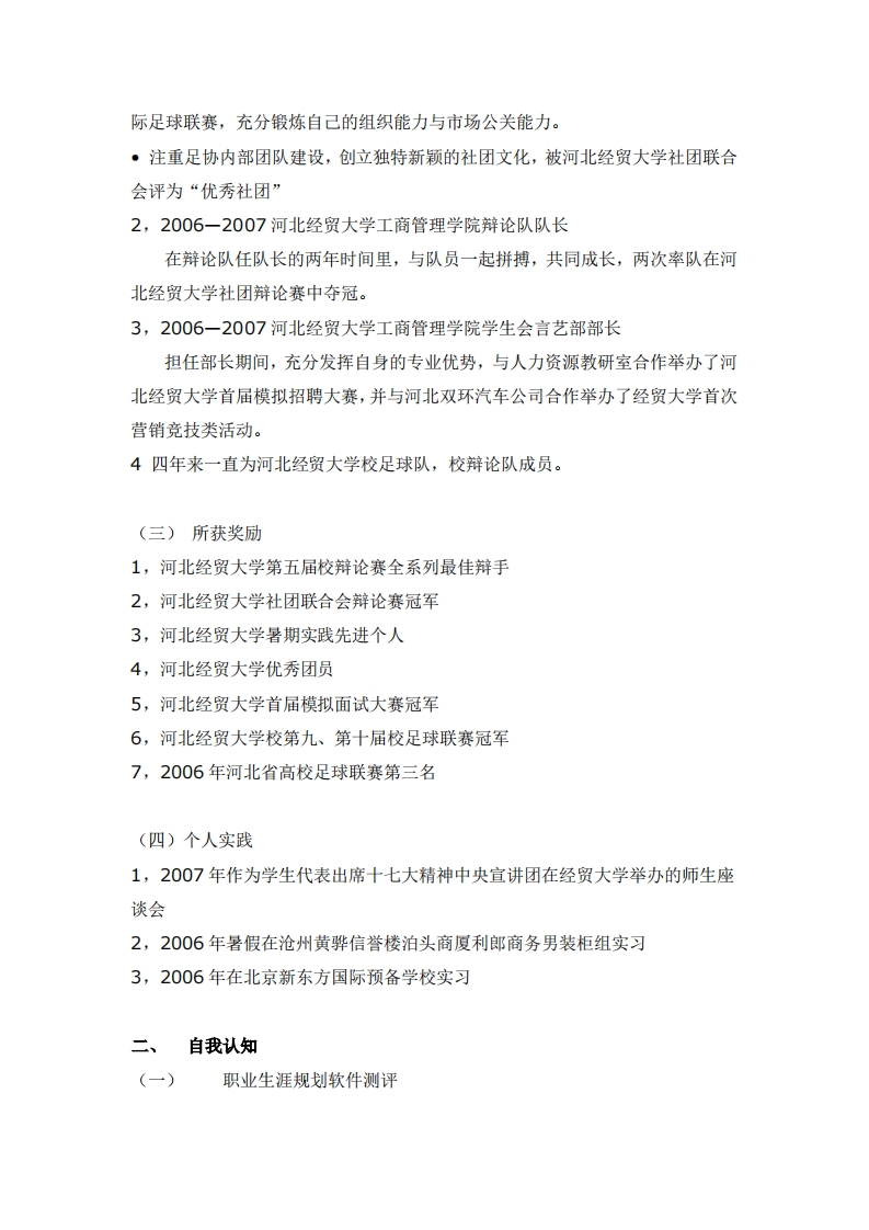 人力资源管理专业大学生职业生涯规划书范文更多大学生职业规划案例,上http:/www.bole13.com/career/examples,无需注册免费下载!前言“人皆生而为新,为前所未有之存在:人皆生而能赢。人皆有其特立独行的方式去审视、聆听、品味、触摸及思考。人皆能举足轻重,思虑明达,洞察秋毫,富有创意,成就功业。”一段哲学家的话为我们点出了人生的意义所在。而作为一名即将离开学校的大四毕业生,我也开始着手规划自己的人生之路。我将培训师作为自己毕生的职业追求,希望用全部的精力和能量来诠释这个职业的价值,另一点则是我也将不断的学习、历练,接受种种考验,在“培训”中不断的成长,塑造属于自己的人生。为了更清晰的了解“培训师”的内涵,我先后走访了多位在培训行业,管理行业有丰富经验的专家,教授,充分听取他们的指导意见,并在计划书中借鉴他们的成功之路,为自己的职业生涯树立参考标杆,从而使自己的作品更具科学性,可行性。本人的能力有限,这份规划书中仍包含着很多不足之处,希望指导老师能提出宝贵意见,使我的计划更科学,更易执行,为我的将来起到指导作用。一、个人基本信息(一)个人概况性别:男院校:河北经贸大学工商管理学院岩业:人力资源管理(二)组织能力12005-2006任河北经贸大学校足球协会会长·担任经贸大学足球协会会长期间,与河北省众多知名企业有广泛接触,并先后与统一集团华北总代理,惠普生电子数码广场合作成功举办两届河北经贸大学校