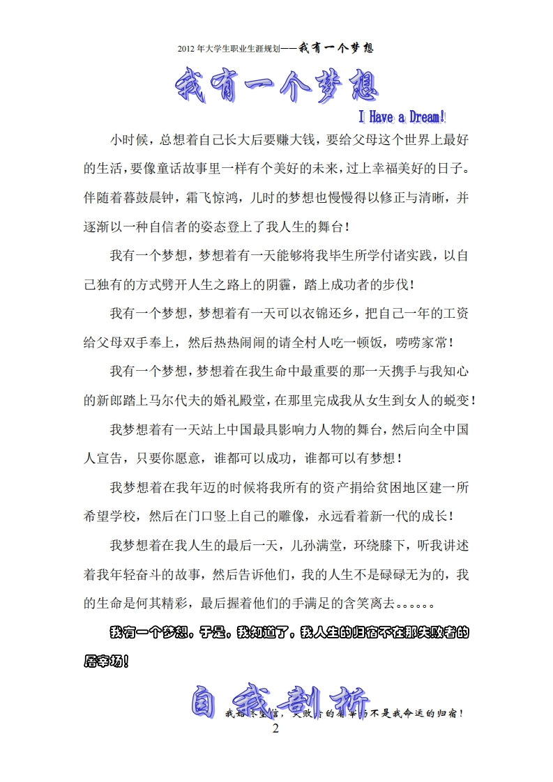 人力资源管理专业职业生涯规划348072@abc4个月前发布关注私信0.77MB16页037人力资源管理专业职业生涯规划此内容为付费资源,请付费后查看¥13¥22黄金会员免费钻石会员免费立即购买您当前未登录!建议登陆后购买,可保存购买订单付费资源 第1页 / 共16页 第2页 / 共16页 试读已结束,还剩14页,您可下载完整版后进行离线阅读 THE END规章制度 文本预览 2012年大学生职业生涯规划一一我有一个梦想大学生职业生隆观刘我有一个梦想一、我有一个梦想二、自我剖析三、职业制析四、我的目标五、自我改造六、梦想在起航我始终坚信,失败者的屠幸场不是我命运的归宿! 查看更多 收起部分 喜欢就支持一下吧收藏