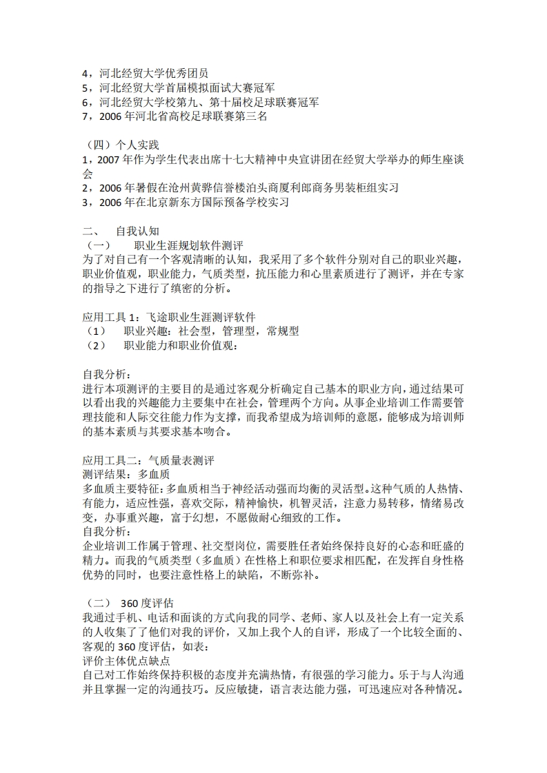人力资源管理专业大学生职业生涯规划书范文前言“人皆生而为新,为前所未有之存在:人皆生而能赢。人皆有其特立独行的方式去审视、聆听、品味、触摸及思考。人皆能举足轻重,思虑明达,洞察秋毫,富有创意,成就功业。”一段哲学家的话为我们点出了人生的意义所在。而作为一名即将离开学校的大四毕业生,我也开始着手规划自己的人生之路。我将培训师作为自己毕生的职业追求,希望用全部的精力和能量来诠释这个职业的价值,另一点则是我也将不断的学习、历练,接受种种考验,在“培训”中不断的成长,塑造属于自己的人生。为了更清晰的了解“培训师”的内涵,我先后走访了多位在培训行业,管理行业有丰富经验的专家,教授,充分听取他们的指导意见,并在计划书中借鉴他们的成功之路,为自己的职业生涯树立参考标杆,从而使自己的作品更具科学性,可行性。本人的能力有限,这份规划书中仍包含着很多不足之处,希望指导老师能提出宝贵意见,使我的计划更科学,更易执行,为我的将来起到指导作用。一、个人基本信息(一)个人概况性别:男院校:河北经贸大学工商管理学院专业:人力资源管理(二)组织能力12005-2006任河北经贸大学校足球协会会长·担任经贸大学足球协会会长期间,与河北省众多知名企业有广泛接触,并先后与统一集团华北总代理,惠普生电子数码广场合作成功举办两届河北经贸大学校际足球联赛,充分锻炼自己的组织能力与市场公关能力。·注重足协内部团队建设,创立独特新颖的社团文化,被河北经贸大学社团联合会评为“优秀社团”2,2006一2007河北经贸大学工商管理学院辩论队队长在辩论队任队长的两年时间里,与队员一起拼搏,共同成长,两次率队在河北经贸大学社团辩论赛中夺冠。3,2006一2007河北经贸大学工商管理学院学生会言艺部部长担任部长期间,充分发挥自身的专业优势,与人力资源教研室合作举办了河北经贸大学首届模拟招聘大赛,并与河北双环汽车公司合作举办了经贸大学首次营销竞技类活动。4四年来一直为河北经贸大学校足球队,校辩论队成员。(三)所获奖励1,河北经贸大学第五届校辩论赛全系列最佳辩手2,河北经贸大学社团联合会辩论赛冠军3,河北经贸大学暑期实践先进个人