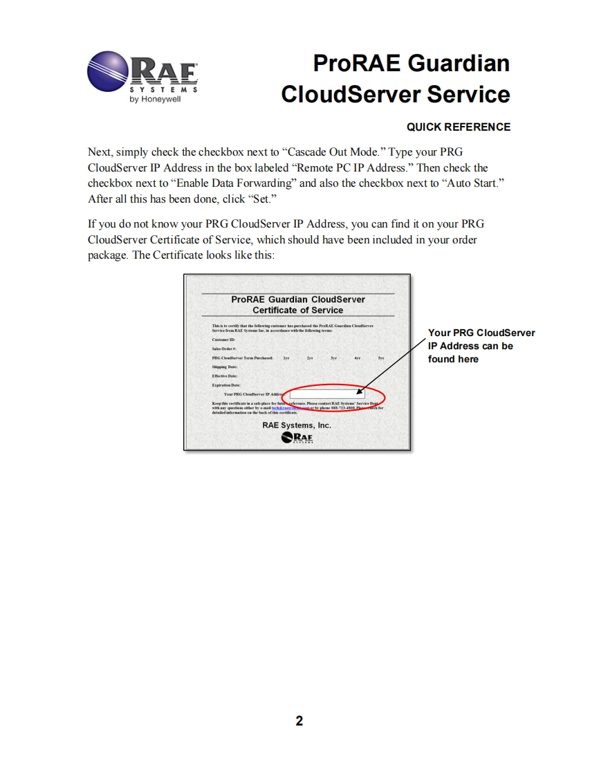 RAEProRAE GuardianS Y S T E Mby HoneywellCloudServer ServiceQUICK REFERENCEThank you for purchasing the ProRAE Guardian(PRG)CloudServer Service fromRAE Systems by Honeywell.We hope you will be pleased with the ease and convenienceit provides you.Getting StartedYou should have received several documents with your PRG CloudServer package.Oneof them is called the "Certificate of Service."Please keep this document in a safe place,as you will need to refer to it whenever contacting RAE Systems about your PRGCloudServer service.To start connecting to your PRG CloudServer,simply modify the settings on all of yourPRG installations as follows:Sending Instrument Readings To Your PRG CloudServerTo send readings from any PRG installation to your PRG CloudServer,first make sureyour PRG installation is connected to the Internet with a"live"connection.You canvalidate this by simply opening up an Internet Explorer window and connecting to acommon site like www.cnn.com or www.amazon.com.Make sure this works beforegoing any further.After doing this,launch ProRAE Guardian on your computer.Once launched,open upthe“Options”dropdown on the Command Center toolbar to reveal the“Data Options”selection and select it.Once the Data Options dialog has opened,click on the "DataForwarding"tab.The dialog should look like this:Data OptionsFormats Alarm Datalog Data Forwarding Platform2Type your PRG1.Check the checkboxEnable Remote Vewers-Alow remote Viewers to view datafrom this PCCloudServer IPnext to“Cascade OutParameters (Th他PCaddress hereListen Port:9726☐Enable Badup Port20Mode"Max Vewer:32Cascade Out Mode-Send data toParameters emote PC)4.Check the checkboxRemote PC1PAd女e3.Check the checkboxnext to“Auto Start'Remote PC Port97next to“Enable5.Click"Set""Data Forwarding"SetCancel☐