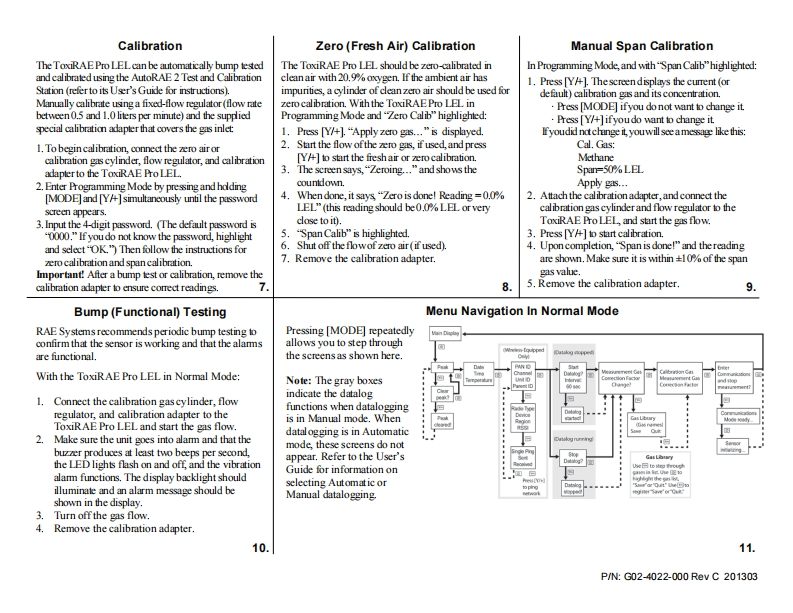 ToxiRAE Pro LELWARNINGSUser InterfaceQuickStart GuideRead Before OperatingThe ToxiRAE Pro LEL's user interface consists ofThe ToxiRAE Pro LEL User's Guide must bethe display,four LED lights,an alarm buzzer,and twocarefully read by all individuals who have or willkeys,[MODE]and [Y/+].The LCD dsplays real-timehave the responsibility of using,maintaining,orreading in specified measurement units,sensor type,servicing this product.The product will perform asalarm type (when inalarm,includingcal.or bumpdesigned only if it is used,maintained,and servicedoverdue),Man Down status,battery status,datalog(ifon),in accordance with the manufacturer's instructions.and radio and connection quality (if available).CAUTION!Gas inletBelt clip (on back)Never operate the monitor when the cover isLEDsLEDremoved.Remove monitor top cap,rear cover,andbattery only in an area known to be non-hazardous.AlarmBuzzerDisplay3775 N.First SL3TIN$San Jose,CA95134-1708USAby Homeywoll01YEPh0ne:408952-8200Fax400-952-8480[MODE]key[Y/+]keyEmail:customerservgraesystems.comww.raesystems.com23.Charging The ToxiRAE Pro LELTurning The ToxiRAE Pro LEL OnTurning The ToxiRAE Pro LEL OffAlways fully charge the battery before use.Contacts onPress and hold [MODE]for 3 seconds.DuringPress and hold [MODE].A 5-second countdown tothe bottom of the ToxiRAE Pro LEL meet the cradle'sstartup,the battery,buzzer,vibration alam,andshutoff begins.You must continue pressing on thecontact pins,transferring power.While charging,theLEDs are tested,and then the ToxiRAE Pro LELkey for the entire shutoff process.Ifyou removeLED on the cradle glows red.When the battery is fullyperforms self-testing of its functions.When theyour finger from the key during the countdown,thecharged,the LED glows green.main measurement screen appears,the ToxiRAEshutoffoperation is canceled and the ToxiRAE ProPro LEL is ready for calibration or use.LEL continues normal operation.APlace ToxiRAEB ConnectAcPro LEL inadapter to chargingNote:If the battery is almost fully discharged,theWhen the countdown beeps stop and you see"Unitcharging cradlecradle andplug it into ACmessage"Battery too low!Needs charging.Off,"release your finger from the [MODE]key.Raised lippower sourcePowering offl"shows in the display and theThe ToxiRAE Pro LEL is now off.locks intoToxiRAE Pro LEL shuts off.You must charge thecradle'sbattery before you can use the instrument.latchChargingLatchstatus LEDrelease4.5.6.