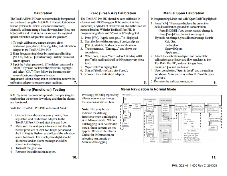 ToxiRAE Pro PIDWARNINGSUser InterfaceQuickStart GuideRead Before OperatingThe ToxiRAE Pro PID's user interface consists ofThe ToxiRAE Pro PID User's Guide must bethe display,four LEDlights,an alarm buzzer,andcarefully read by all individuals who have or willtwo keys,[MODE]and [Y/+].The LCDdisplayshave the responsibility of using,maintaining,orreal-time reading in specified measurementunits,sensorservicing this product.The product will perform astype,alarm type (when in alarm including cal.or bumpdesigned only if it is used,maintained,and servicedoverdue),Man Down status,battery status,datalog(ifon),in accordance with the manufacturer's instructions.and radio and connection quality (ifavailable).CAUTION!Gas inletBelt clip (on back)Never operate the monitor when the cover isLEDsLEDremoved.Remove monitor top cap,rear cover,andbattery only in an area known to be non-hazardous.AlarmBuzzerRAERAE Systems,Inc.Display3775 N.First St.287车节车T6M车San Jose,CA95134-1708 USAPhone:408-952-8200Fax:408-952-8480[MODE]keyOYEmall:customerservraesyste ms.com7[Y+]keywwwraesystems.com23.Charging The ToxiRAE Pro PIDTuming The ToxiRAE Pro PID OnTurning The ToxiRAE Pro PID OffAlways fully charge the battery before use.Contacts onPress and hold [MODE]for 3 seconds.DuringPress and hold [MODE].A 5-second countdown tothe bottom of the ToxiRAE Pro PID meet the cradle'sstartup,the battery,buzzer,vibration alam,andshutoff begins.You must continue pressing on thecontact pins,transferring power.While charging,theLEDs are tested,and then the ToxiRAE Pro PIDkey for the entire shutoff process.Ifyou removeLED on the cradle glows red.When the battery is fullyperforms self-testing of its functions.When theyour finger from the key during the countdown,thecharged,the LED glows green.main measurement screen appears,the ToxiRAEshutoffoperation is canceled and the ToxiRAE ProPro PID is ready for calibration or use.PID continues normal operation.APlace ToxiRAEB ConnectAcPro PID inadapter to chargingNote:If the battery is almost fully discharged,theWhen the countdown beeps stop and you see"Unitcharging cradlecradle andplug it into ACmessage"Battery too low!Needs charging.Off,"release your finger from the [MODE]key.Raised lippower sourcePowering offl"shows in the display and theThe ToxiRAE Pro PID is now off.locks intoToxiRAE Pro PID shuts off.You must charge thecradle'sbattery before you can use the instrument.latchChargingLatchstatus LEDrelease4.5.6.