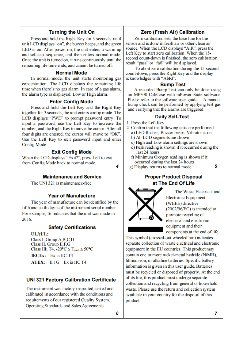 mPower ElectronicsWarningMaking Powerful SensesNever operate the monitor when the cover is removed.Remove the monitor cover and battery only in area knownas non-hazardous.Use only mPower's lithium battery part number M500-0001-000[1.17.02.0002](3.6V,2700mAh,AA size.UNI 321This instrument has not been tested in an explosive gas/airatmosphere having oxygen concentration greater than 21%..Substitution of components will impair suitability forQuick Start Guideintrinsic safety and void warranty..It is recommended to bump test with a knownconcentration gas to confirm the instrument is functioningproperly before use.Before use,ensure that the colorless ESD layer on thedisplay is not damaged or peeling.(The blue protective filmmay be removed.)AvertissementN'utilisez jamais le moniteur lorsque le couvercle est enleveRetirer le couvercle du moniteur et la batterie uniquementdans une zone connue comme non dangereuse.Utilisez uniquementle numero de piece de la batterie aulithium mPower M500-0001-000[1.17.02.0002].Cet instrument n'a pas ete teste dans une atmosphereexplosive gaz air ayant une concentration en oxygenesuperieure a 21%.La substitution de composants compromettra l'aptitude a lamPower Electronics Inc.securite intrinse que et annulera la garantie.3046 Scott Blvd.Santa Clara,CA95054.ll est recommande de tester avec un gaz de concentration cwww.mpowerinc.comonnu pour confirmer que l'instrument fonctionne correctement avant de l'utiliser.info@mpowerinc.comAvant I'utilisation,assurez-vous que la couche ESD incolorede l'ecran n'est pas endommagee ou epluchee.(LePN:M001-4030-000vl.31film protecteur bleu peut etre enleve.)Read Before OperatingDisplayThe User's Guide must be carefully read by all1.Gas name,includes:CO,H2S,O2individuals who have or will have the responsibility2.Remaining time unit:Months,Days or Hoursof using,maintaining,or servicing this product.3.Question markThe product will perform as designed only if itis used,maintained,and serviced in accordance with4.Unit status indicator"OK"the manufacturer's instructions.5.Gas concentration unit,for alarm setting displayUser Interface6.Remaining operation timeThe UNI 321's user interface consists of the LCD7.Low Batterydisplay,LEDs,an alarm buzzer,two keys:Left Key[Confim/Number increasing]and Right Key[Power/Cursor moving],an alligator clip,and asensor.H2Sonths DaysHourAlligator clipLED alarmwindowLowLCD showingBatterymonths of useremainingPower/Cursormoving keyConfirm/Numberincreasing keySensorBuzzer13