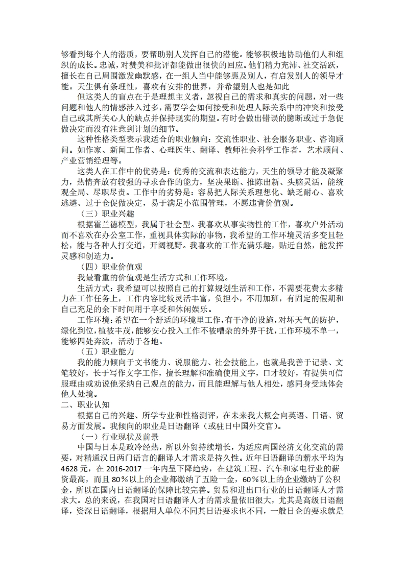 日语翻译大学生生涯规划书前言大学四年将如何度过,这不仅事关你毕业后成为什么样的人:反之,一开始你有什么样的职业规划和人生目标,也事关你四年大学生活的质量与收敛。站在现代人才的需求和现代教育观念的高度去放眼未来,我希望我通过四年的努力能够“专业成才,精神成人”。对大学生来说,这是一种理想,更是一种现实追求,然而职业生命是有限的,如果不及时进行有效的职业生涯规划,势必会造成生命和时间的浪费。作为当代大学生,职业生涯规划从跨入校门开始:就业指导工作从入学教育开始,因此我试着为自己拟写一份职业生涯规划,借机全面的规划下未来人生,于是下面就我个人情况即进行我的职业生涯规划设计。一、自我认知(一)个人基本特征我从小性格比较内向,在熟悉的人面前很放开自我,在生人面前却很沉默寡言,然而随着成长经历上的一些事件和教训,慢慢长成一个外向开朗的女生。现在性格阳光活泼,喜欢到处结交朋友,在公众场合不吝于与陌生人搭讪聊天,很容易自来熟进而打成一片,因为个性随和自如和男生也很交好,所以我的朋友很多,其中不乏异性,社交能力比较强,却会在正式发言的场合感到紧张。虽然大大咧咧但同样不会口无遮拦,比较能够设身处地为他人着想,在乎他人的感受。富于同情心,看到生活中的细节都很关心,乐于助人否则内心就会很愧疚、良心不安,喜欢为人打抱不平、替人出头,对于朋友们的烦恼和求助我也很热心,不善于拒绝别人。爱好广泛,喜欢二次元但不是宅女,很乐意到处旅游玩乐,很会享受生活,感受自然之美,业余会出去爬山、散步、钓鱼、打球、骑车、看书,在家会听音乐,唱歌,画画,弹乐器、追番等。值得强调的是自从入宅以来受其影响爱上日本这个国家和他们的民族文化历史,一直想学好日语。我的思维向来比较特立独行、异于常人,更多的时候喜欢听取别人的建议,但在一些方面十分执着,有主见且不在意别人的眼光。善于创新,事实证明从小虽然反应慢做事拖拉但动手能力很强,经常能够发明一些新颖的玩意或手工品,如果真的下定决心要做一件事的时候就会十分认真、投入、用心、追求完美,但如果信念不强就会缺乏毅力和耐心,导致意志不坚定,容易半途而废、“三分钟热度”,体现在学习上比如:作业一直拖到最后才写,复习也准备得不充分老是临时抱佛脚,制定的学习计划总是难以长期坚持下来。所以一直我的成绩总是不能超过前几名,而且每次考好后就缺乏自信担心下次不能发挥出如此水平,使得每每成绩跌宕起伏十分不稳定。我情绪向来稳定,只是表现得很夸张喜怒哀乐都在脸上,但无论发生什么都不慌张,也很少生气,喜欢自言自语心里想什么都一股脑说出来也不管有没有人听,给大家看到的一般都是我积极的一面,消极的时候就自己藏着掖着慢慢消化,自我修复能力也很强,而且我希望永远只传递正能量。(二)MBT1性格测评根据MBT1性格测试,我属于EN月型人一一公共关系专家(外向、直觉、情感、判断),从测评结果来看,这类人主导功能是情感,辅助功能是直觉。具有平和的性格与忍耐力,热爱人类,有同情心,反应敏捷和有责任感。高度关注别人的情绪、需要和动机。他们以热情的态度对待生命,很自然地去关心别人,能