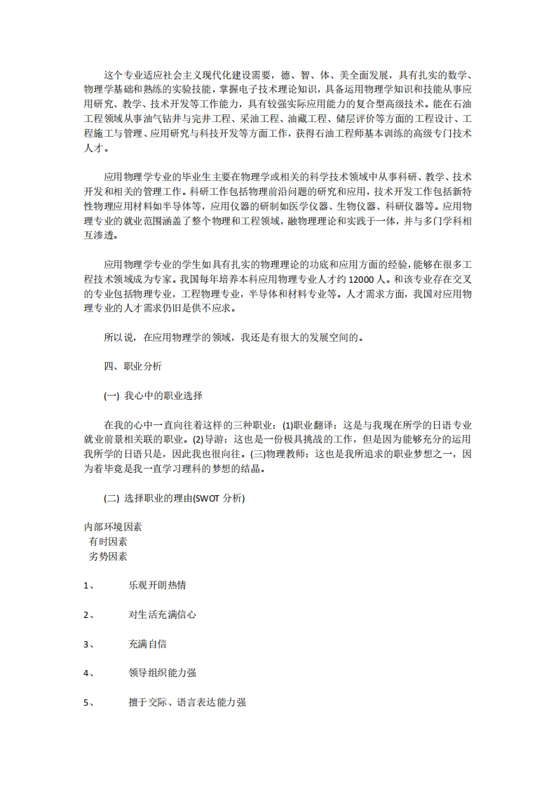 前言我们生活在一个充满机遇的社会中,但我们必须清楚和明确的是,在这个社会中同样有着另外一个名词,那就是“挑战”。我们不得不面对和接受各种各样的挑战,从而让自己变得更加优秀。规划自己的职业生涯应该从现在开始就应该深深地根治在我们的脑海中。我始终相信,只有在学习中明确了自己的目标,才能更加迅捷有效地完成自己的人生理想和目标。为了用理智代替茫然,用成熟代替无知,让我们现在就为我们职业生涯的规划努力吧!一、自我分析来到民大,学习日语己经将近一年的时间了。在这一年当中,我深刻的认识了自己。我性格活泼开朗、热情好动。对自己所从事的工作总是持续的高度的热情,一旦开始就不会轻言放弃。学习之余,喜欢运动,尤其喜欢散步和跑步。听音乐在我的生活中也同样扮演的十分重要的角色,通过音乐陶冶自己的情操一直是我所信奉的原则。擅于与其他人进行沟通和交流,喜欢和人打交道,具有很好的交际能力。热爱生活,所以留心观察自己身边的人和事,并且和周围的人始终保持的良好和睦的关系。为人耿直正直,做事踏实肯干,因而很容易得到老师领导及周围朋友的信任。对自己的工作及周围发生的事情永远都有自己的想法和观点。有很好的团队精神,同样是我在集体生活以及校园活动中比较活跃的法宝之一。我的劣势是,有的时候稍微有一点情绪化,也会导致事情发展的不顺利。全家的希望都寄托在我一个人的身上,所以我必须具备抛出一切杂念,全心全意倾注于自己的学业和事业的决心,事实证明我的确具备这种因素和理念。偶尔有时候会因为身边人的不重视,而感到烦闷和厌倦工作。二、解决自我分析中的劣势根据自我性格的分析,我还存在着很多亟待改善的地方,也许正是这些因素制约着我的前进和发展,因此,我必须紧自己的全力改掉这些坏毛病,是自己得到很好的完善。认真的对待自己的学习和工作,有效地控制自己的情绪,无论如何将属于自己的工作进行到最后一刻。在无法得到大家的关注和重视的时候,也要本着认真负责的态度完成属于袭击的那一份工作和任务。只有这样才能拥有快乐的学习和工作生活。三、专业就业方向及前景(一所学专业(日本语言文化)作为一名理科考生,选择日语专业对我来说其实是意见极具挑战的事情。但是,出于对日语及日本文化的好奇我还是坚定的选择了日语专业。在如今中日两国关系不断升温的时候,日语学习也逐渐被大家认可和接受并且广泛流传。随着学习日语的人数的不断增加,单纯的日语学习者在就业方面己经不再具备着其独有的优势,我想只有将日语的学习与其他专业的涉猎联系起来,我们的才会有更加广阔的发展空间。无论是从事日语翻译、导游,或是就职于日企、从事和中日两国关系有关的各项工作,都需要讲日语与其他个有关方面紧密的联系起来,这样就能够达到事半功倍的效果。(二)感兴趣的专业(应用物理学)