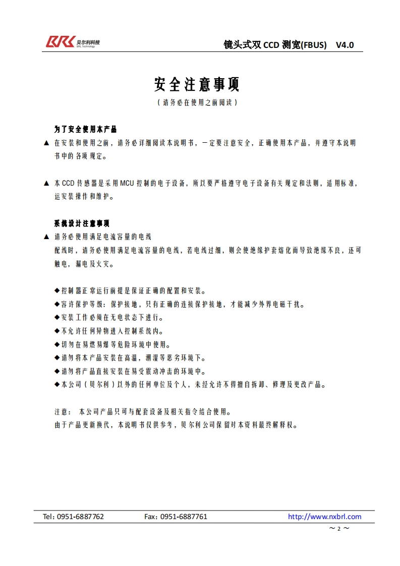尺《贝尔技镜头式双cCD测宽(FBUS)V4.0KR☒贝尔利科技BRL Technology镜头式双CCD测宽(FBUS)产品说明书V4.0适配控制器型号为SPR0320Si-CCD-W2-ENT/SPR0320Si-CCD-W2-CC/SPR0320Si-CCD-W2-DP/SPR0320Si-CCD-W2-008888地址:银川市金凤工业集中区四号路北段电话:0951-6887762传真:0951-6887761网址:htp:/wwww.nxbrI.comTel:0951-6887762Fax:0951-6887761http://www.nxbrl.com1