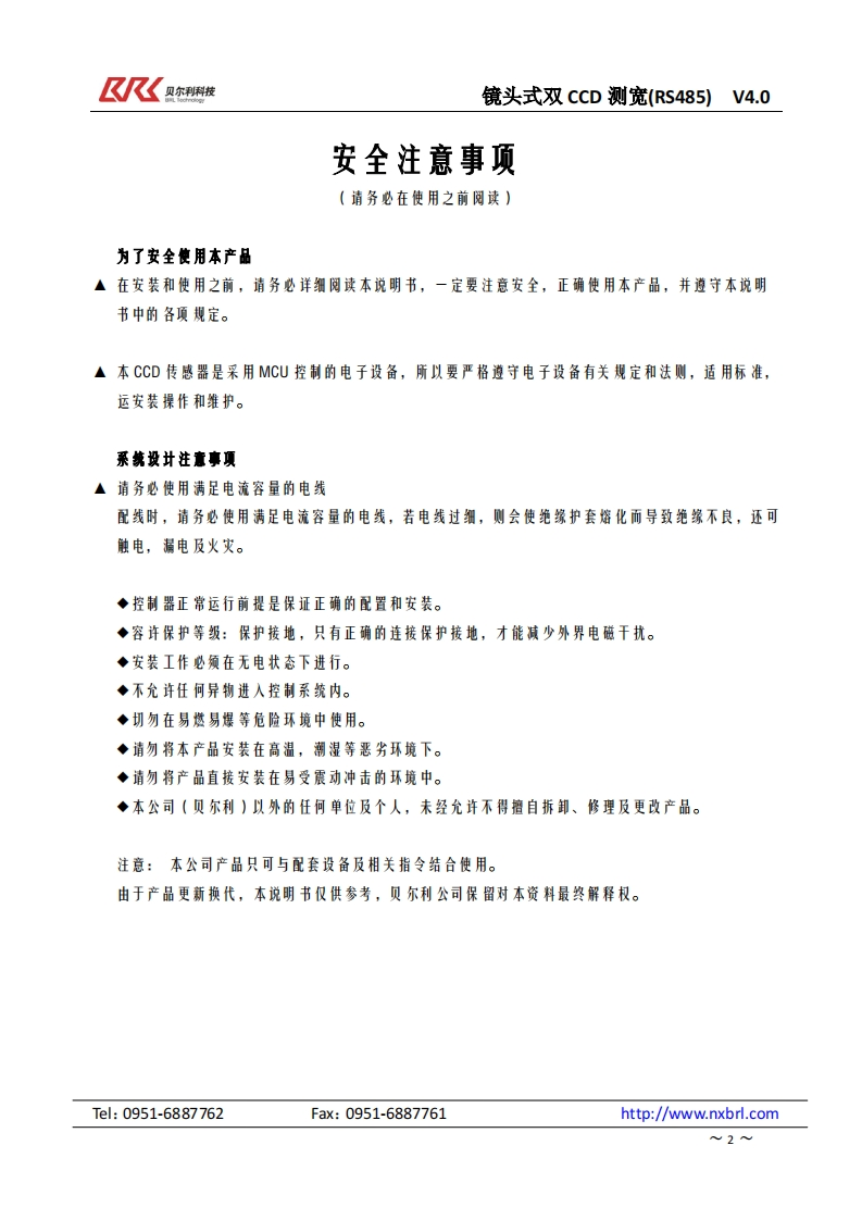 尺《贝尔技镜头式双cCD测宽(Rs485)V4.0K次☒贝尔利科技BRL Technology镜头式双CCD测宽(RS485)产品说明书V4.0适配控制器型号为SPR0320Si-CCD-W2-485a88888地址:银川市金凤工业集中区四号路北段电话:0951-6887762传真:0951-688761网址:htp:/www.nxbrI..comTel:0951-6887762Fax:0951-6887761http://www.nxbrl.com1
