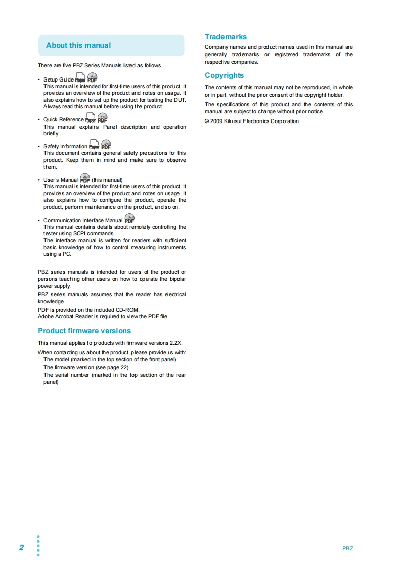 KIKUSUPart No.IB027577Ju2021Installation andPreparationBasic FeaturesMemory,Response,3USER'S MANUALand ConfigurationSequences4BIPOLAR POWER SUPPLY PBZ SeriesExternal Control,Parallel Operation,5PBZ20-20and SynchronizationMaintenancePBZ40-10PBZ60-6.7SpecificationsPBZ80-5App5