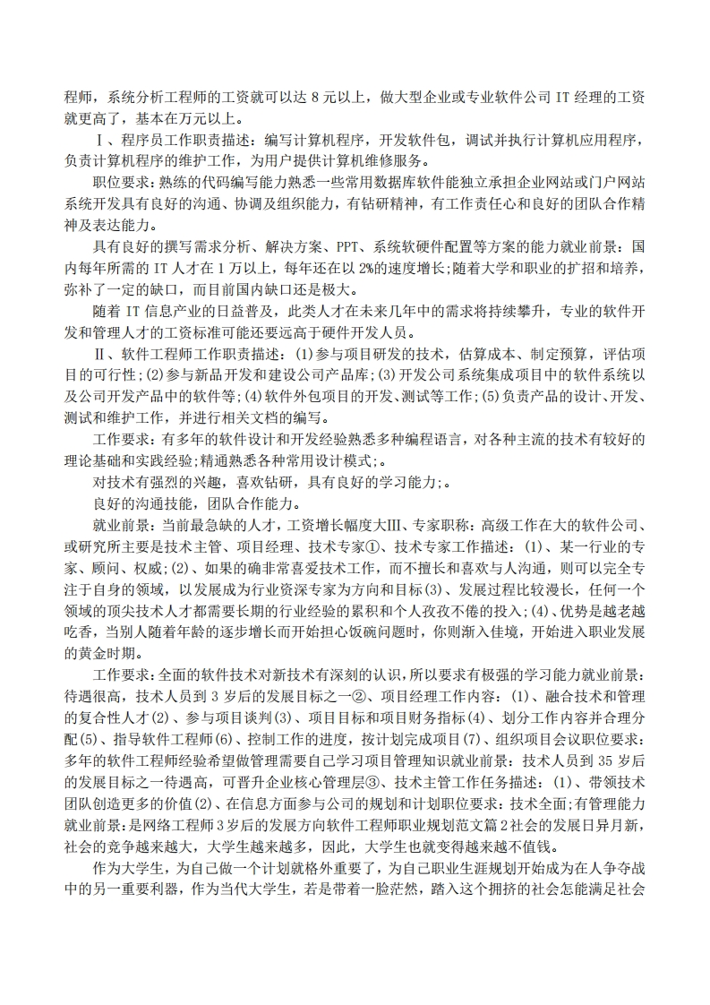 软件工程师职业规划范文职业规划为软件工程师的人生及就业规划提供了理论基础,你知道软件工程师的职业生涯规划书该怎么写吗?下面是爱汇给大家整理的软件工程师职业规划范文,供大家阅读!软件工程师职业规划范文篇1一、软件工程师的职业优势1、最具增值潜力的职业,掌握企业核心数据、软件技术,具有不可替代的竞争优势。2、新型软件人才缺口大,27%的行业增长速度导致软件人才年缺口达3万,高薪高福利成为必然。3、可实现专业零基础入行,6-18个月的强化训练和职业化引导,就可成为企业急需的技能型软件人才。4、就业面广,一专多能,实践经验适用于各个领域。5、增值潜力大,职业价值随着自身经验的丰富以及项目运作的成熟,升值空间一路看涨。6、职业发展前景广阔、软件工程师到项目经理仅一步之遥,从容晋升Manager。二、软件工程师解读何谓软件工程师,软件工程师是通过学习和训练,掌握软件技术的理论知识和操作技能的软件技术人员。软件工程师能够从事计算机软件、网站的设计、开发、维护和测试工作。具体来说,我们可以从企业技术部的岗位体系中作一些了解。企业(或政府)信息化过程中需要以下四种人:1、企业信息化管理:负责信息化建设中的目标与方案决策,信息化建设、升级、更新:2、工程技术人员:负责软件系统的分析、设计开发、数据库、使用、维护和升级:3、运行维护岗位:负责软件开发代码的编写以及基本的开发和测试:4、操作应用人员操作应用人员:主要应用软件进行日常的管理工作。一般来说,IT企业的IT技术职位根据职能可以分为管理岗位:企业信息主管CI0、总监、IT经理、项目经理等:工程技术岗位:规划设计师、网络工程师、系统工程师、软件工程师和数据库工程师等;运行维护岗位:数据库管理员、系统管理员、程序员等:操作岗位:办公文员、CAD设计员、网页制作员、多媒体制作员等。根据企业规模大小,规模较小的企业,一个岗位可能涵盖几个岗位的内容,系统管理员既要负责系统管理,又要承担网络管理:大企业则会分的比较专业,有软件设计师、系统集成工程师、网络工程师、程序员和系统测试工程师等。软件工程师的三个进阶:阶段职称岗位前景和待遇初级程序员专业软件工程师必经阶段网页制作工程师中级普通的软件设计人员软件公司/企事业单位/数据中心普通的系统分析人员软件公司/大公司/外包公司软件系统分析师工资过万软件系统设计师需求量6万,缺口极大,当前最极缺软件工程师职业规划过程主要有以下几步:两年以上的小型企业四年左右的中型企业大型企业或跨国集团公司第一步,小企业的软件开发设计编程人员:第二步,进入大中型企业,同样的软件开发设计编程工作,工资就可能完全不同了,一般都在3元以上。做了部门经理时,还可以高达5元或以上;第三步,学习更全面的知识成为普通的软件工程师工资就高达35元以上:第四步,学习更全面的知识成为专业的软件工程师,如软件设计工