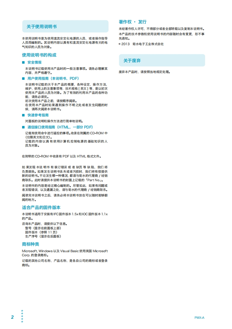 KIKUSUIPart No.IB027398按用途分类目录5Jul 2022各个部分的名称6使用准备9电源线的连接10接通电源11关于负载13负载用导线16连接输出端子17感应功能18用户使用指南基本功能21测量值的显示与设定值的显示22面板操作23输出的操作23直流稳压电源恒电压(CV)电源和恒电流(CC)电源24PMX-A系列作为恒电压(CV)/恒电流(CC)电源使用26PMX18-2A保护功能和报警27系统配置(CONFIG)设定31PMX18-5A预设内存功能39面板操作的锁定(键锁定)41PMX35-1A进行遥控41工厂出厂时的设定(初始设定)42PMX35-3A外部控制43概要44PMX70-1A关于J1连接器44输出端子的绝缘46PMX110-0.6A输出电压的控制49输出电流的控制51PMX250-0.25A输出的0N/0FF控制53外部监视55PMX350-0.2A并联/串联运转57PMX500-0.1A并联运转58串联运转61维护65校正66技术规格[英文]71附录00000(选项86动作不良时的对应方法8866列