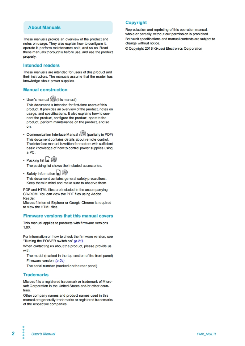 KIKUSUPART NO.IB032411Jul.2018User's ManualContents 5Component Names 8Multiple-output RegulatedDC Power SupplyInstallation 13PMX Series (Multiple-output)Basic Functions 26PMX32-3DUPMX32-3TRExternal Control 60PMX32-2QUParallel Operation and SeriesOperation 67Maintenance 77Specifications 85Appendix 960000000000000000092o99⑧a