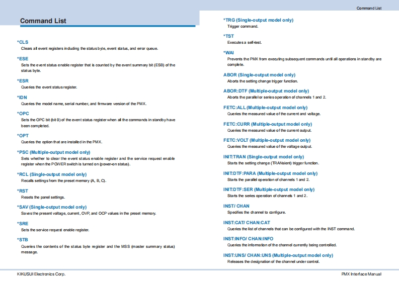 E⑧KIKUSUPART N0.005381JuL 2018Communication Interface ManualRegurated DC Power Supply PMX SeriesSingle Output modelPowerPMX18-2APMX18-5APMX35-1APMX35-3APMX70-1APMX110-0.6APMXPMX250-0.25APMX350-0.2APMX500-0.1AMultiple Output modelPMX32-3DUPMX32-3TRPMX32-2QUKIKUSUI ELECTRONICS CORP.1-1-3 Hgashiyamata,suauki-ku,Yokohama.2240023.p3nTt+8145482.6353FaC+81.45482.6261http://www.kikusui.co-jp/enKIKOSO