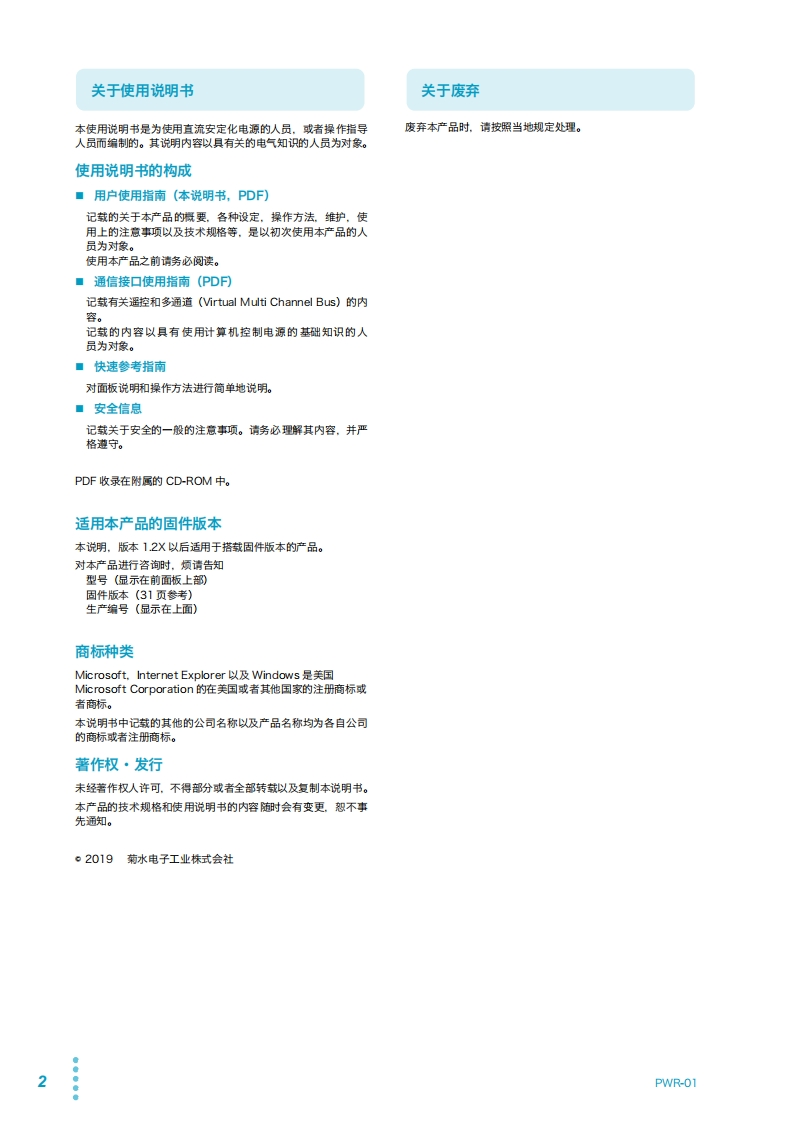 各部分的名称和作用8⑧KIKUSUPart No.IB035095Dec 2024使用准备13电源线的连接14关于负载19负载电缆的选择21输出端子的绝缘22连接输出端子24电源的接通31遥感功能33基本功能37测试值的显示与设定值的显示38用户使用指南面板操作40输出的操作41动作概要45恒电压(CV)电源和恒电流(CC)电源47直流稳压电源作为恒电压(CV)/恒电流(CC)电源使用49保护功能50PWR-01系列系统配置(CONFIG)设定60预设内存功能76400W机型面板操作的锁定(键锁定)77系统配置快捷键功能78PWR401LPWR401ML从遥控切换到本地79PWR401MHPWR401H应用功能81泄放电路功能82内部电阻可变功能84800W机型序列功能85同步运行86PWR801LPWR801ML外部控制89PWR801MHPWR801H概要90关于J1连接器/J2连接器91连接外部电压(Vext)时的注意事项951200W机型输出电压的控制97输出电流的控制99PWR1201LPWR1201ML输出的ON/OFF控制101输出停止控制103PWR1201MH PWR1201H警报清除控制104外部监视1052000W机型并联/串联运转107单控并联运转108PWR2001LPWR2001ML串联运转114PWR2001MH PWR2001H维护119校正120清扫122技术规格[英文]123400W model 125800W model 128●○1200W model 1310000002000W model 134Common Specifications 137附录143