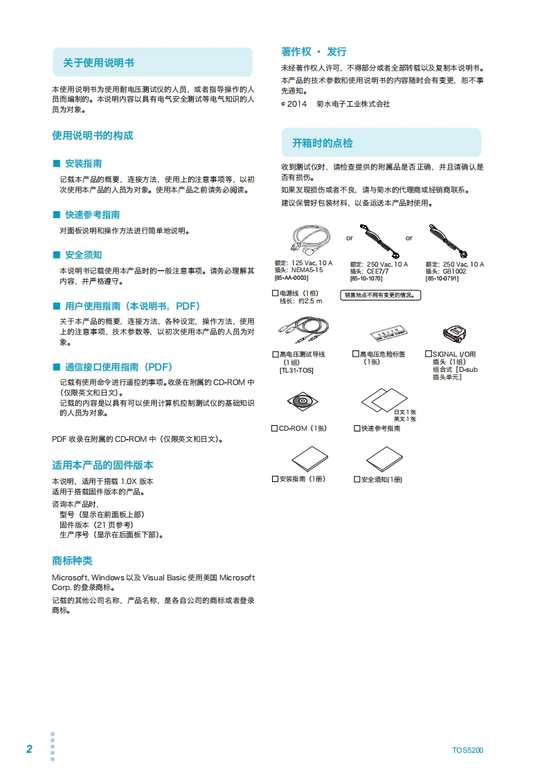 @KKUSUPART NO.IB027976Jul 2021按使用目的分类的目录8各个部分的名称10概要13产品的概要14选购件15安装和使用准备17连接电源线18保护外罩的使用19电源的投入20用户使用指南被测试物(DUT)的连接22安全测试指南25测试前的点检26测试中的注意事项26耐电压测试仪遥控时的注意事项27测试,作业中断27紧急情况时的对策27T0S5200禁止事项28关于故障28无故障安全使用28面板基本操作29画面的构成30面板操作32面板内存35耐电压测试37关于判定38无效设定38设定测试条件390000巨配置设定42开始测试46结束测试49外部控制51S1GNAL1/O连接器52测试的开始55面板内存和测试模式的调出56联锁功能57STATUS OUT连接器58维护59开始作业点检60技术规格61公危险附录69本产品产生高电压!初始设定一览70保护功能72○如果错误操作有发生重大事故的危险。测试的开始动作和显示73○为了防止事故的发生,请务必阅读本使用说明书的时序图74「安全测试指南」的部分。动作不良时的对应方法77○请将本使用说明书放在本产品附近,以便操作人员随时阅读。