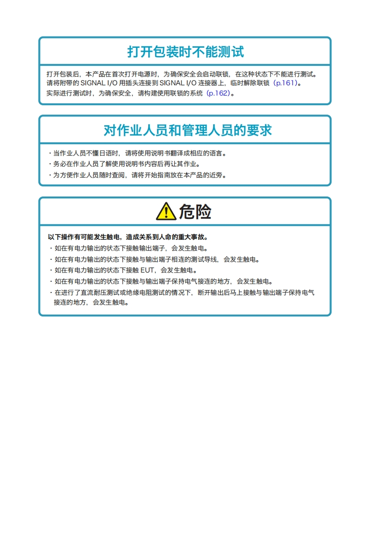 KIKUSUPart No.IB036561Jun 2024目录3各部的名称14用户使用指南为确保测试安全21安全测试复合机安设与使用准备28T0S93系列基本操作43TOS9300T0S9301耐压测试50TOS9311绝缘电阻测试88TOS9302接地导通测试121T0S9303自动测试138外部控制156回@存储功能170系统设置179维护201A危险规格204本产品产生高电压!错误操作有导致重大事故的危险。为防止事故,请务必阅读本使用说明书的“为确保测试安全”。附录224请将本使用说明书放置在本产品的附近,以备作业者随时查阅。